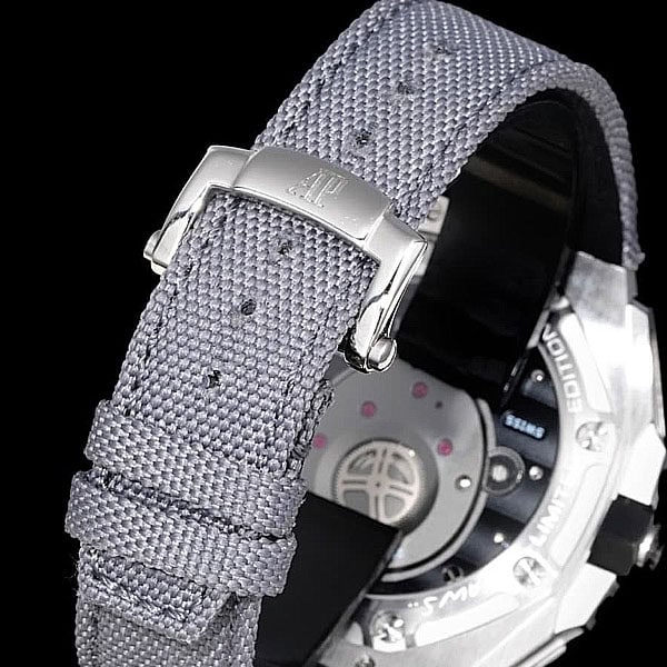 ブレスレットは、インターチェンジャブル仕様のライトグレーカーフストラップ、