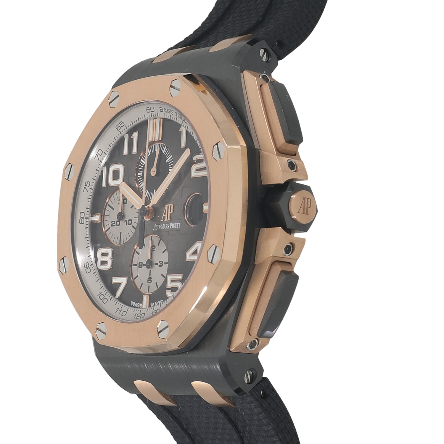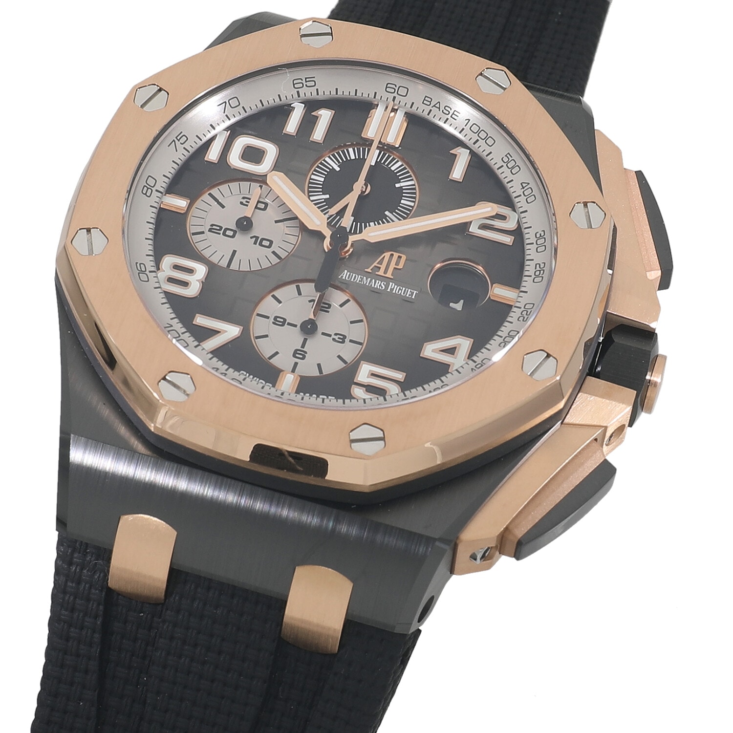 ベルト:テキスタイル加工のグレーラバーストラップ、18Kピンクゴールドピンバックル。