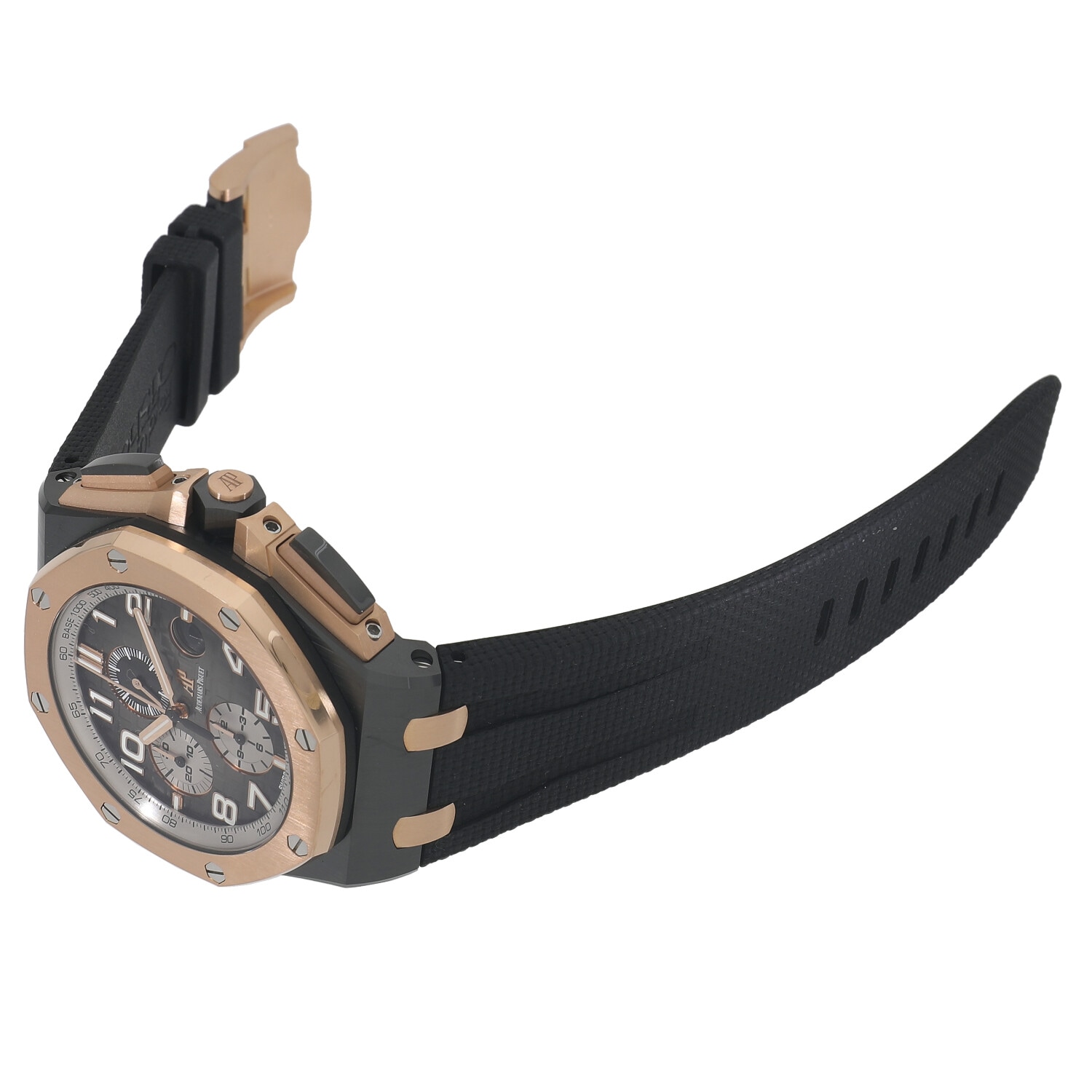 18Kピンクゴールドのベゼルとプッシュボタンガード、ブラックセラミックのプッシュボタンとねじ込み式リューズ。
