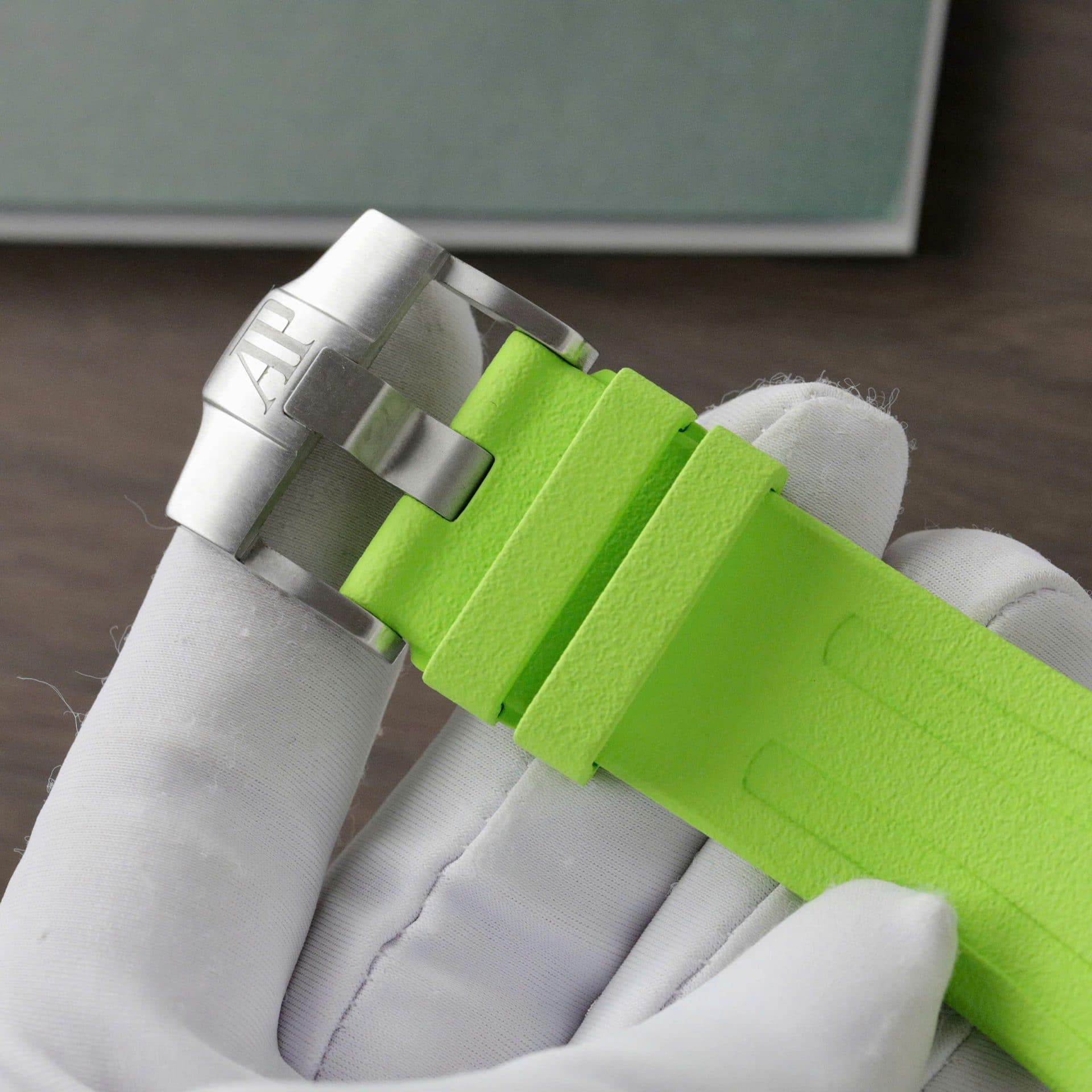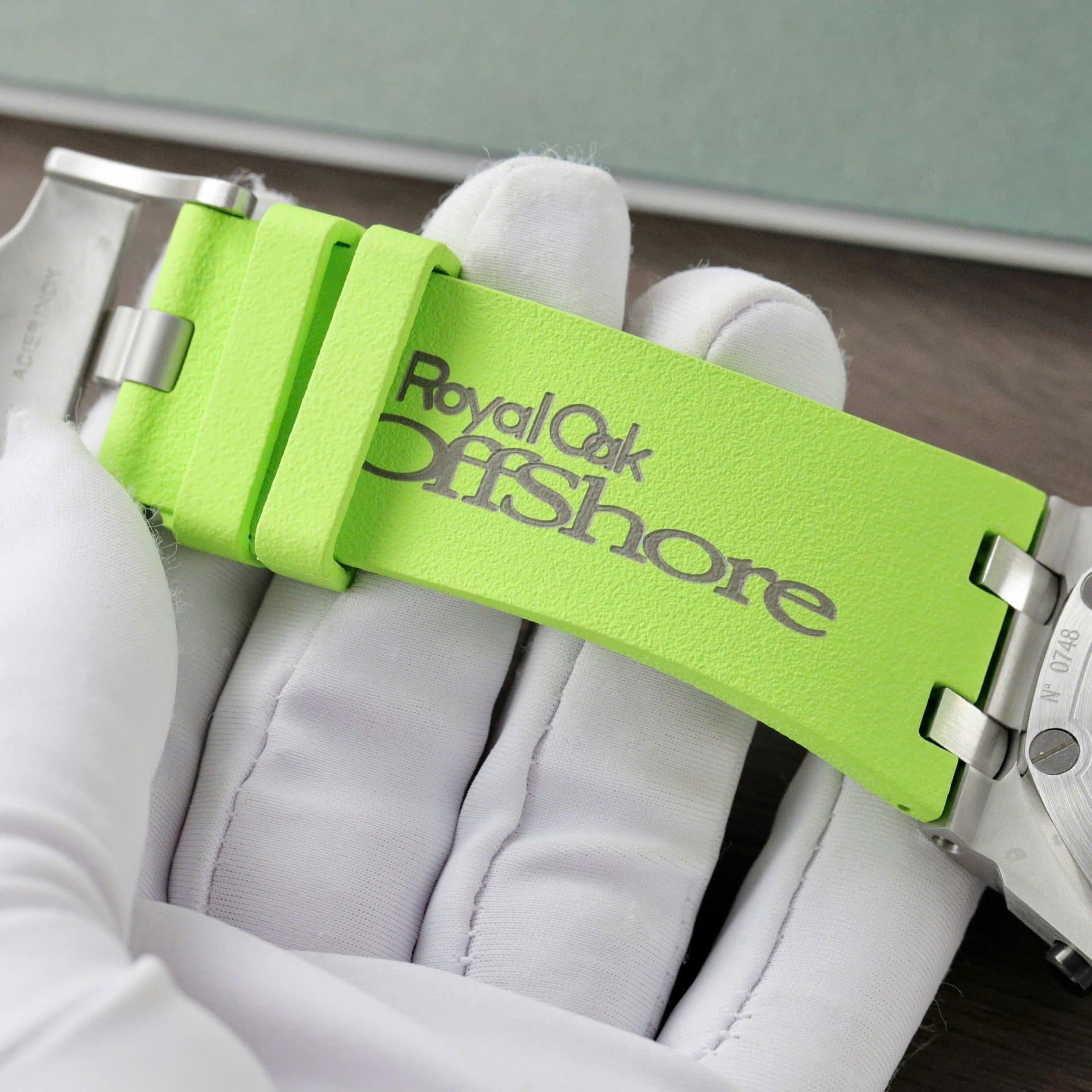 ホワイトゴールドの蛍光色の立体的なアワーマーカーとロイヤルオーク針、