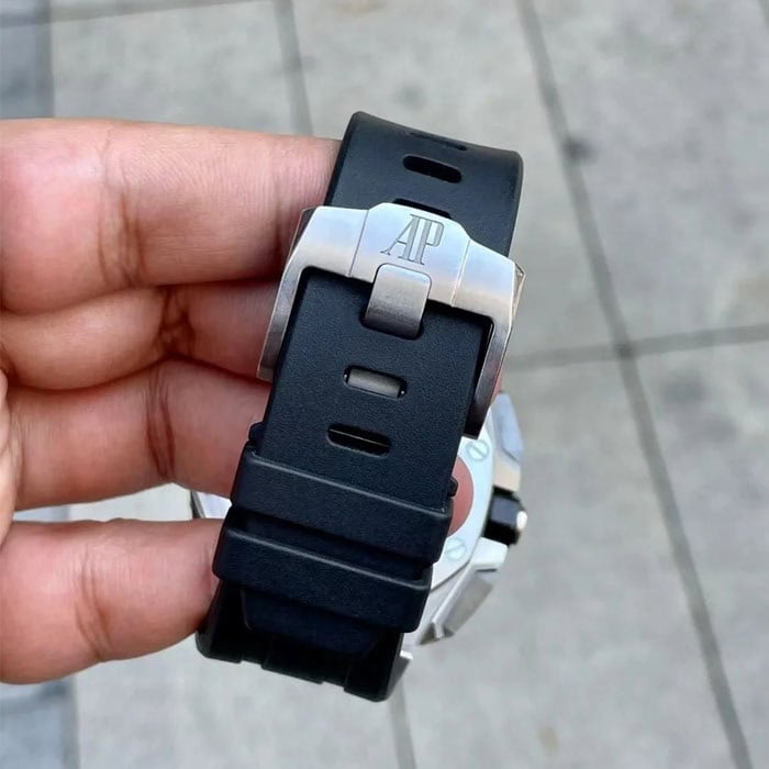 蓄光処理を施したホワイトゴールドのアプライドアワーマーカーとロイヤルオーク針、ブラックのインナーベゼル