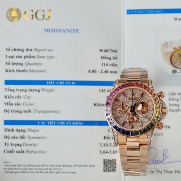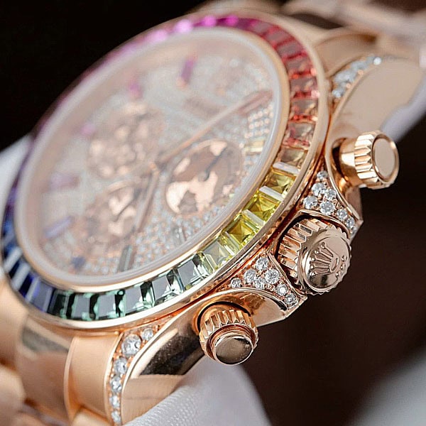 さらに文字盤、ラグ、ケースサイド、にもダイヤモンドを配したラグジュアリー仕様のデイトナコピー時計です。