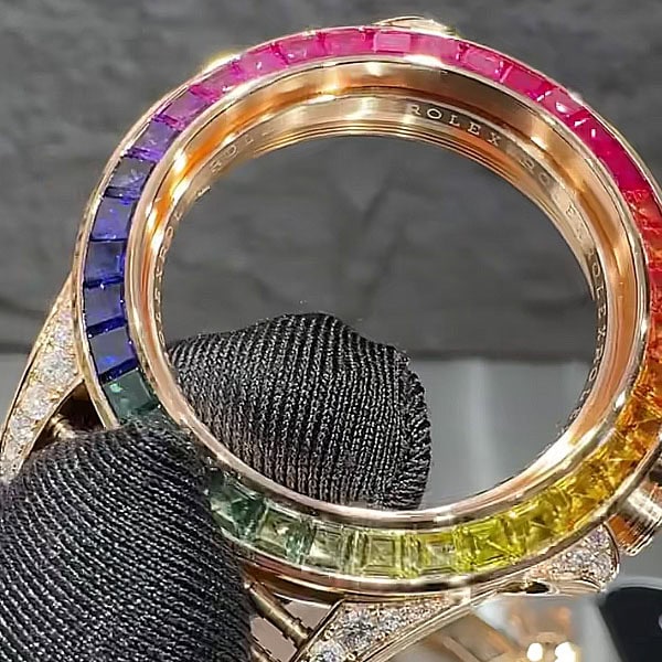 ベゼル:ベゼルに36個、文字盤インデックスに11個のバケットカットカラーサファイアをセット