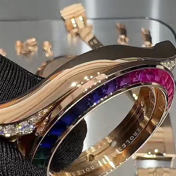 ベゼル:ベゼルに36個、文字盤インデックスに11個のバケットカットカラーサファイアをセット