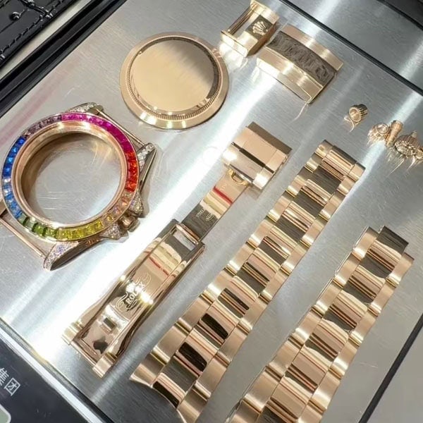 バンド及びベゼル、クラウンなど部分は全部金を厚く切ってくるんでおいた方式です。