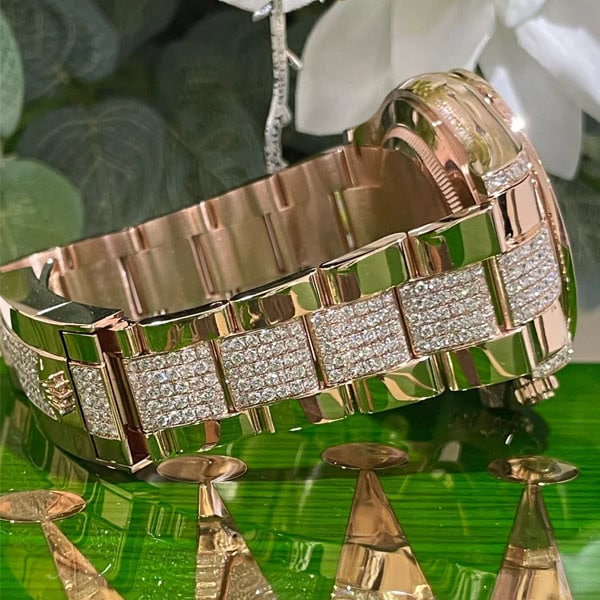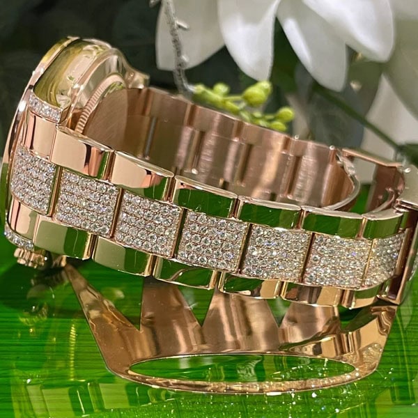 さらに文字盤、ラグ、ケースサイド、にもダイヤモンドを配したラグジュアリー仕様のデイトナコピー時計です。