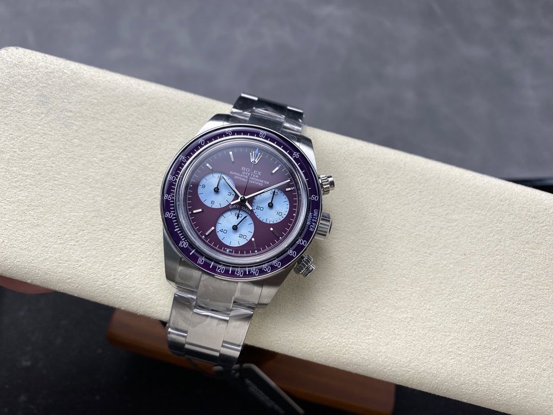 PVDパープルのCal.4130ムーブメントを搭載し、セラミックパープルベゼルとターコイズ×パープルのダイアルが爽やかで芸術的な存在感を放つ一品。