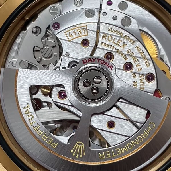 ロレックスのバージョン4131ムーブメントのように、象徴的なコート・ド・ジュネーブストライプを見ることができます。