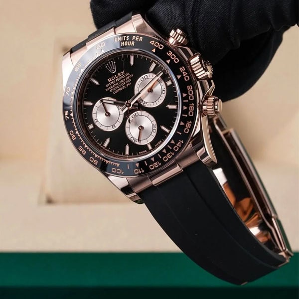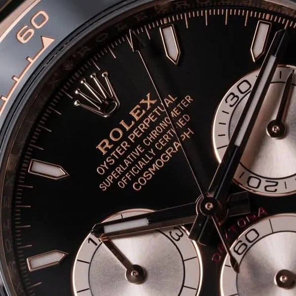 文字盤:ブラック文字盤とローズゴールドサブダイヤル、スティックマーカーと相まって、