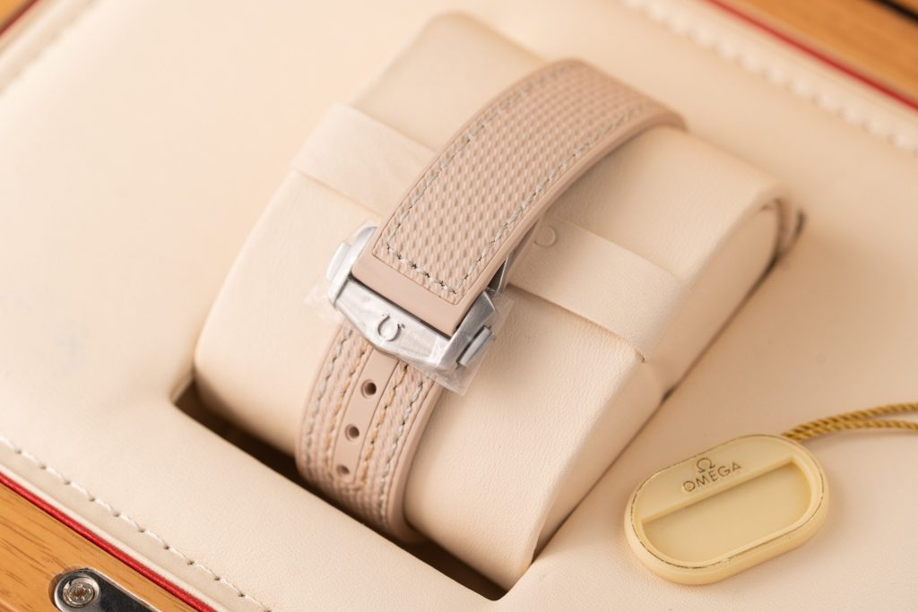 オメガのロゴ、アラビア数字、針、そしてインデックスはブラッシュ仕上げのPVDグレーで、ホワイトのスーパールミノヴァが暗い場所でも視認性を確保します。
