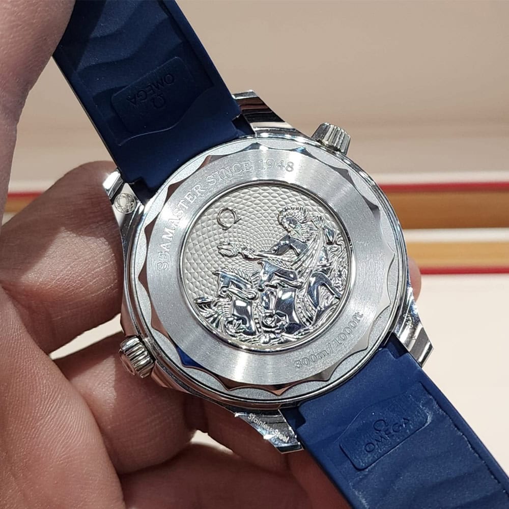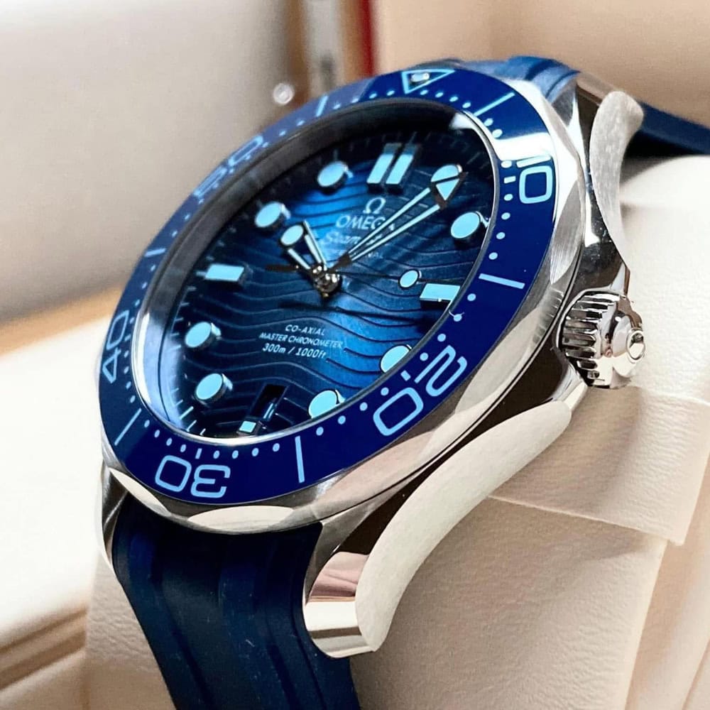 より濃いブルーの色調は、時計の 300 メートル防水性を反映しています。