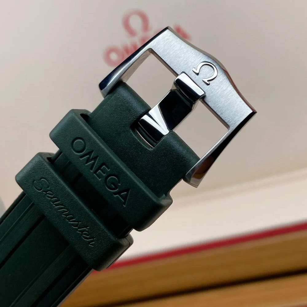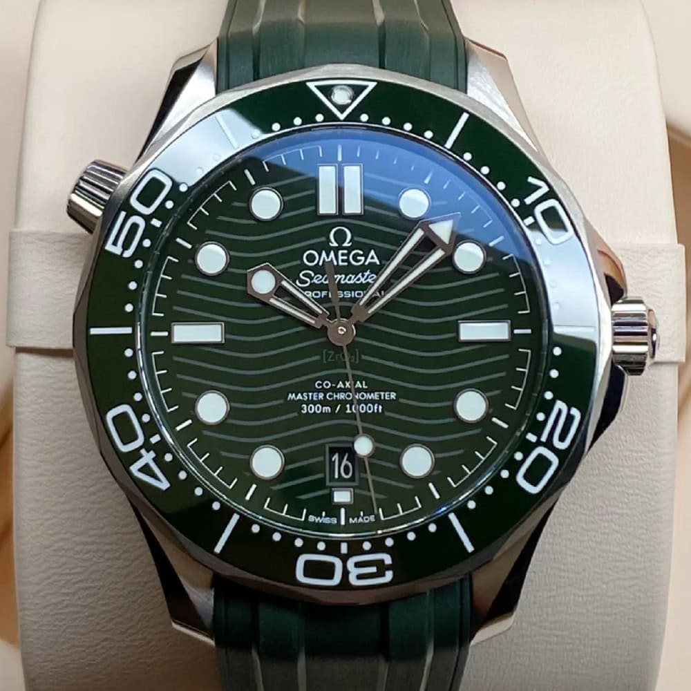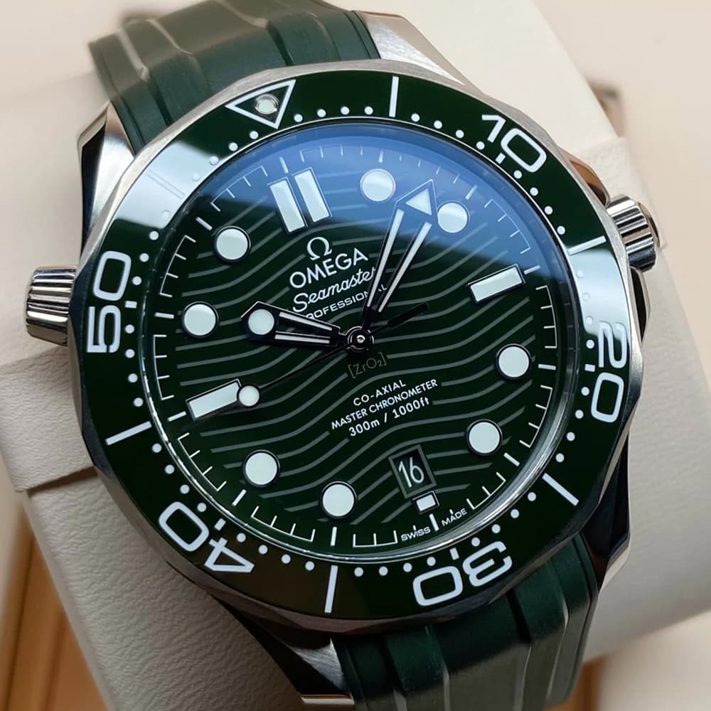 ホワイトエナメルでダイビングスケールを描いたグリーンセラミック製ベゼルが付いています。