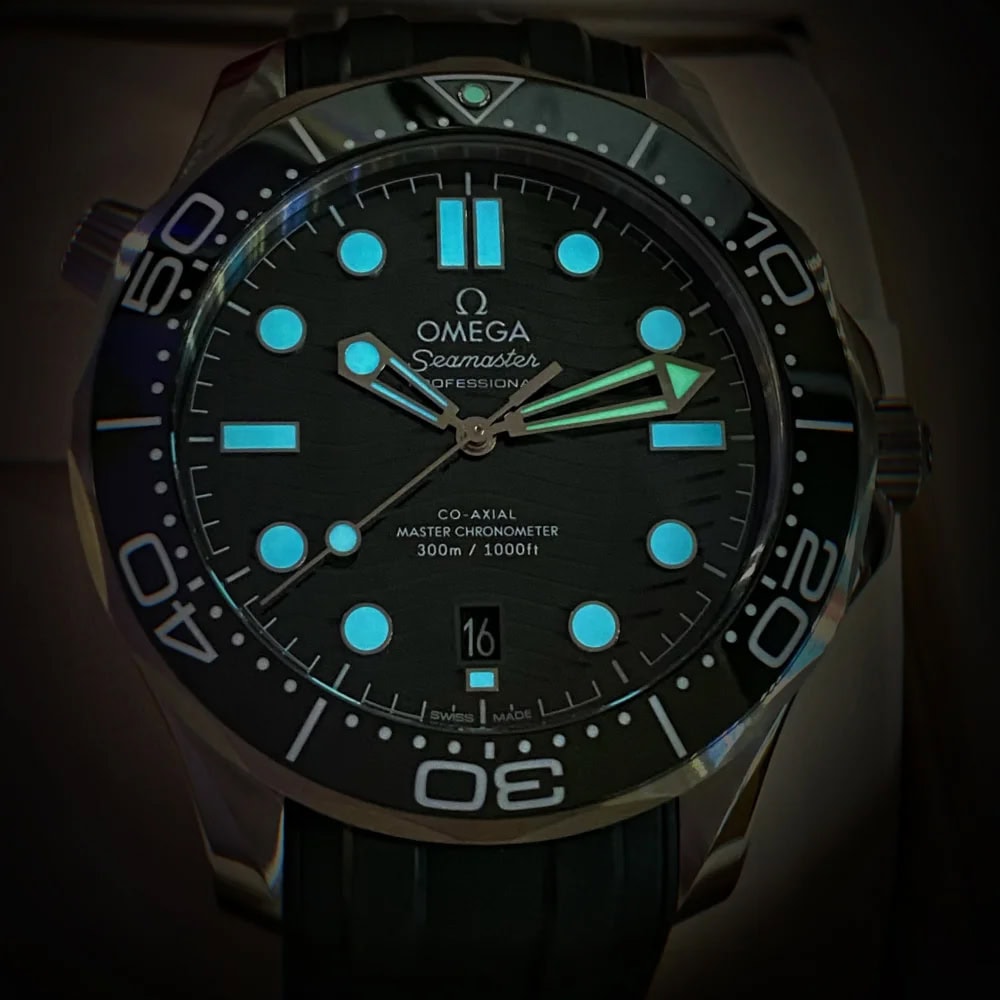 ロジウムプレート加工のスケルトン針と立体的なインデックスにはホワイトのスーパールミノヴァが塗布され、