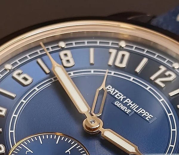 カラトラバ Ref.5224Rは、24時間ダイヤルを追跡する2本のセンター針で、ホームタイムとローカルタイムを計測する。