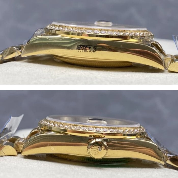 ケース:36mmのオイスターケースはロレックスのオイスタースチールにマッチし、ソリッドな904Lステンレススチールのモノブロック構造の上に18kゴールドコーティングを施された