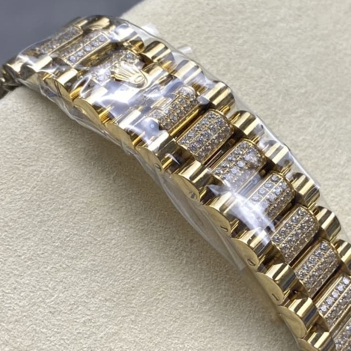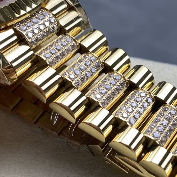 ブレス:人工ダイヤがすべて埋め込み手作業入り!半円形の3列リンクのプレジデントブレスレットは18Kゴールドコーティングされた904Lステンレススチールで作られており、