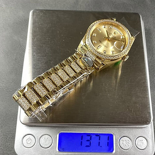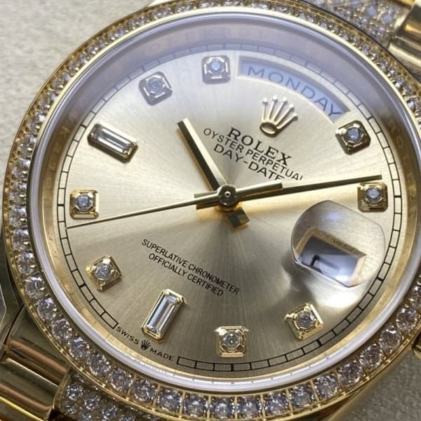 ベゼル:人工ダイヤがすべて埋め込み手作業入り!フルーテッドベゼルは18kゴールドコーティングを施された904Lステンレススチールで作り出されており、
