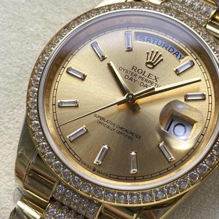 ベゼル:人工ダイヤがすべて埋め込み手作業入り!フルーテッドベゼルは18kゴールドコーティングを施された904Lステンレススチールで作り出されており、