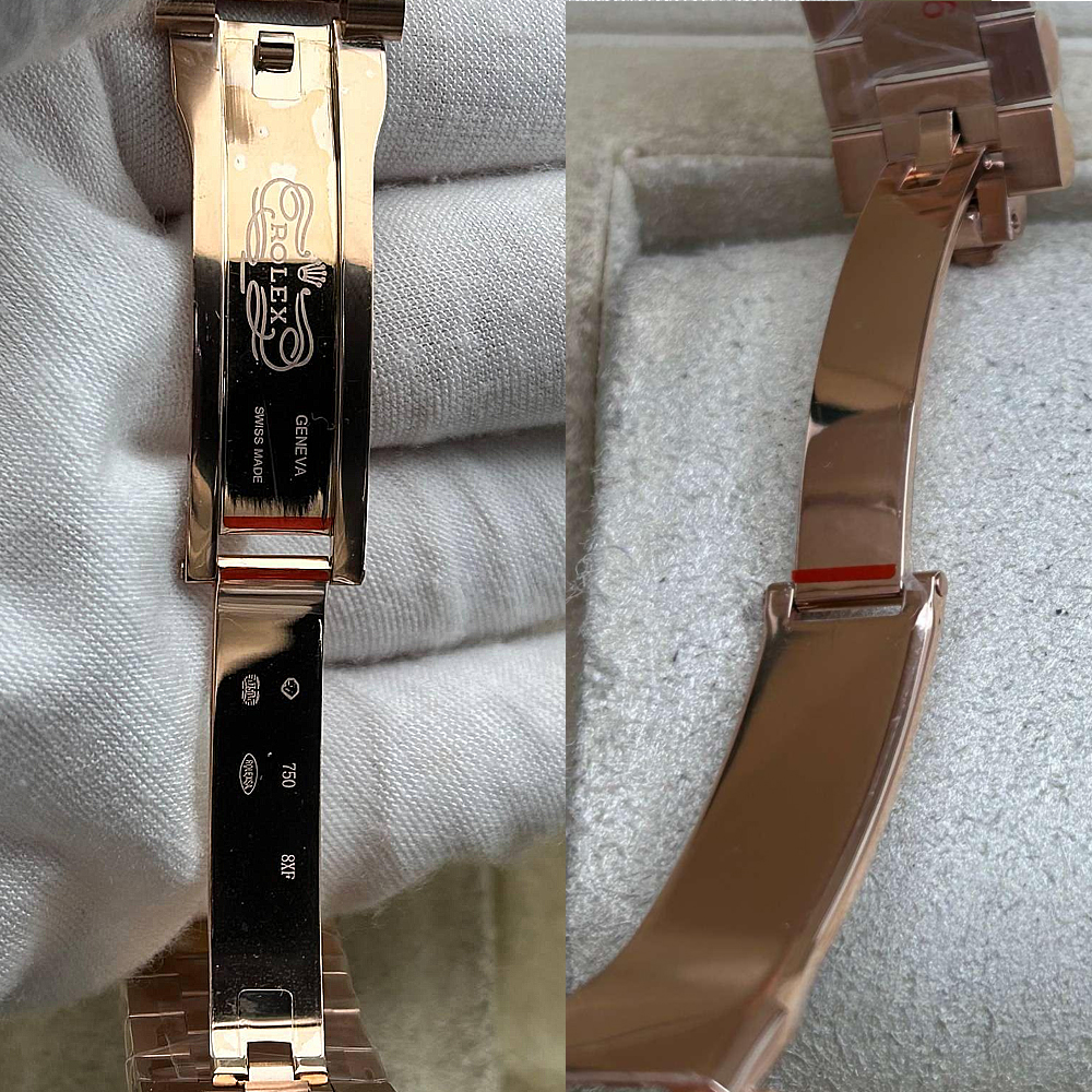 ベルト:半円形の3列リンクのプレジデントブレスレットは18Kローズゴールドコーティングされた904Lステンレススチールで作られており、DLCスクラッチプロテクションコーティングが施されています。しっかりとしたネジ山で簡単にベルト調整が可能です。また、コンシールド・クラウン・クラスプを備え、素早く快適にベルトを装​​着できることを確保しています。