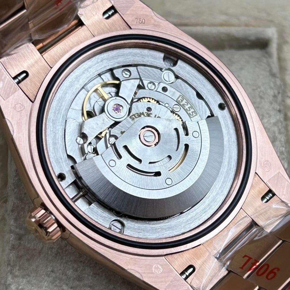 ケース:40mmのオイスターケースはロレックスのオイスタースチールにマッチし、ソリッドな904Lステンレススチールのモノブロック構造の上に18kローズゴールドコーティングを5層施して作られています。スクリュー式のケースバックとねじ込み式リューズを備え、Rehautリングには「ROLEX ROLEX」のレーザー刻印が施されてい ます。寸法はオリジナルのロレックスとまったく同じです。