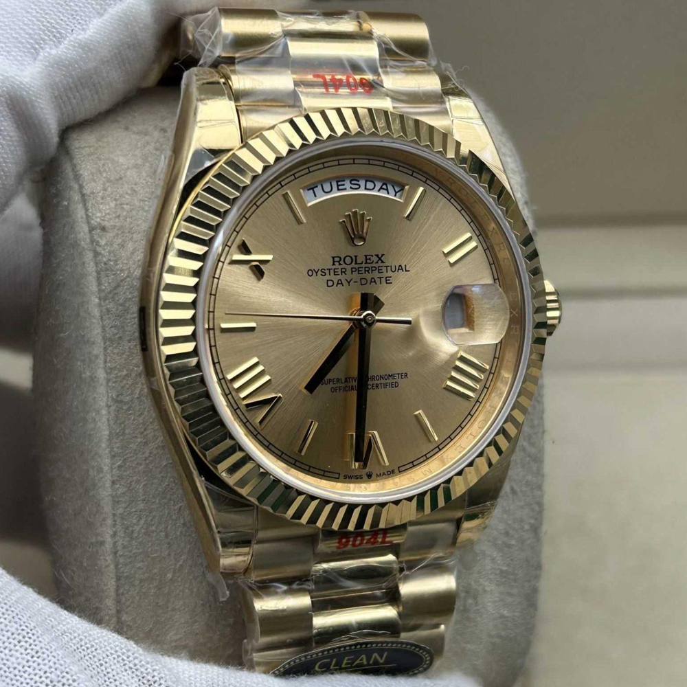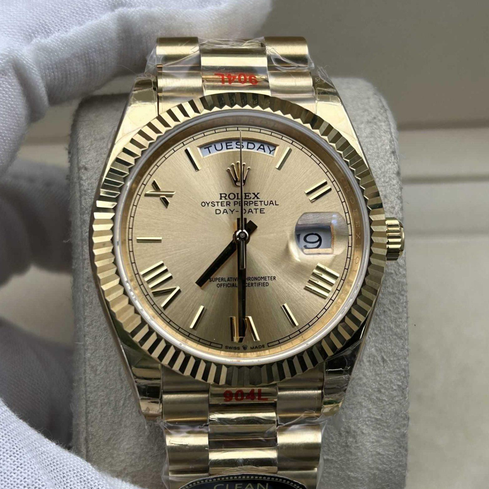 文字盤:シャンパンカラー文字盤には18kイエローゴールドコーティングされたローマ数字マーカーと針が飾られています。クリーンファクトリーは丹念に100%正規品と一致するようにデザインされた高精度のレーザーテキスト、プリント、刻印により、時計の高い視認性を確保しております。正しいデイトフォントとサイズを採用しており、アワーマーカーと針に施された18Kイエローゴールドコーティングは色落ちを防ぐできるのみならず、長年に渡っても、不変の美しさと読みやすさを確保しております。