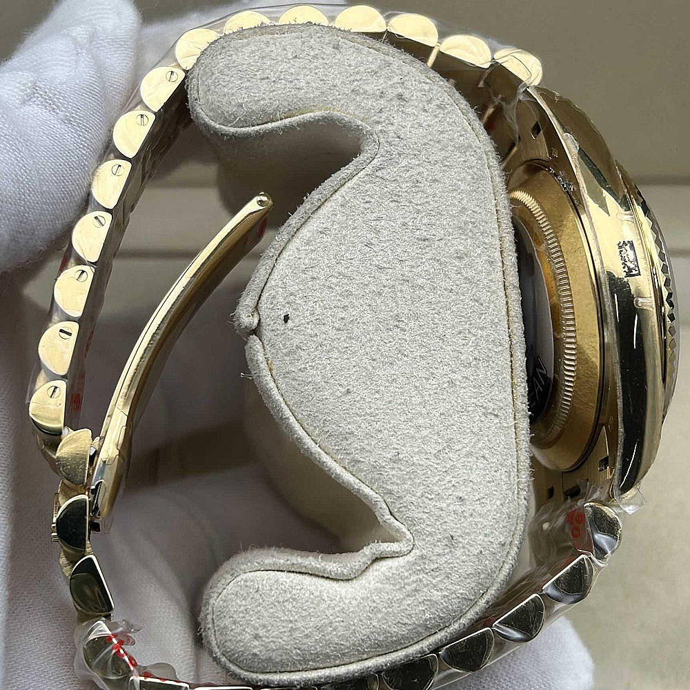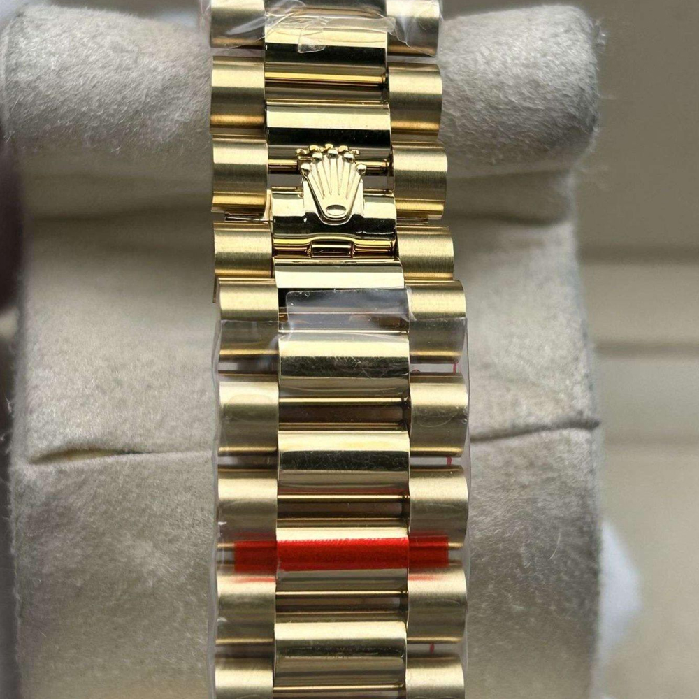 ベルト:半円形の3列リンクのプレジデントブレスレットは18Kイエローゴールドコーティングされた904Lステンレススチールで作られており、DLCスクラッチプロテクションコーティングが施されています。しっかりとしたネジ山で簡単にベルト調整が可能です。また、コンシールド・クラウン・クラスプを備え、素早く快適にベルトを装着できることを確保しています。