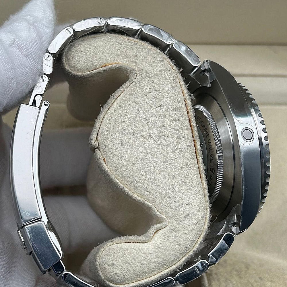 文字盤:Ref. 126600 レプリカのブラック ラッカー ダイヤルには、明るいスーパールミノバブルールミネッセンス蓄光塗料でコーティングされているアワー マーカーと針が飾られており、暗い場所でも優れた視認性を確保しています。レーザーによる精密なテキスト、プリント、刻印が施されたダイヤルは、比類のないクリアさと本物らしさを提供します。正確な日付フォントとサイズ、18Kホワイトゴールドコーティングされたアワー マーカーと針が、この特別な時計にエレガンスと洗練さを加えています。ダイアルにはその特徴的なデザイン要素の一つである目立つ赤の「SEA-DWELLER」という文字が含まれています。