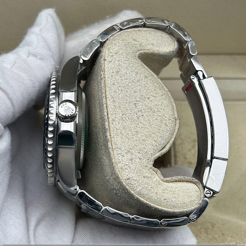 風防:透明度と耐摩耗性を象徴とする高反発サファイアを採用しています。正確な高さはセラミックリンクと調和して配置されており、2.5倍のサイクロプス・レンズを備えています。6時のところにはレザー刻印によるロレックス王冠ロゴがあります。