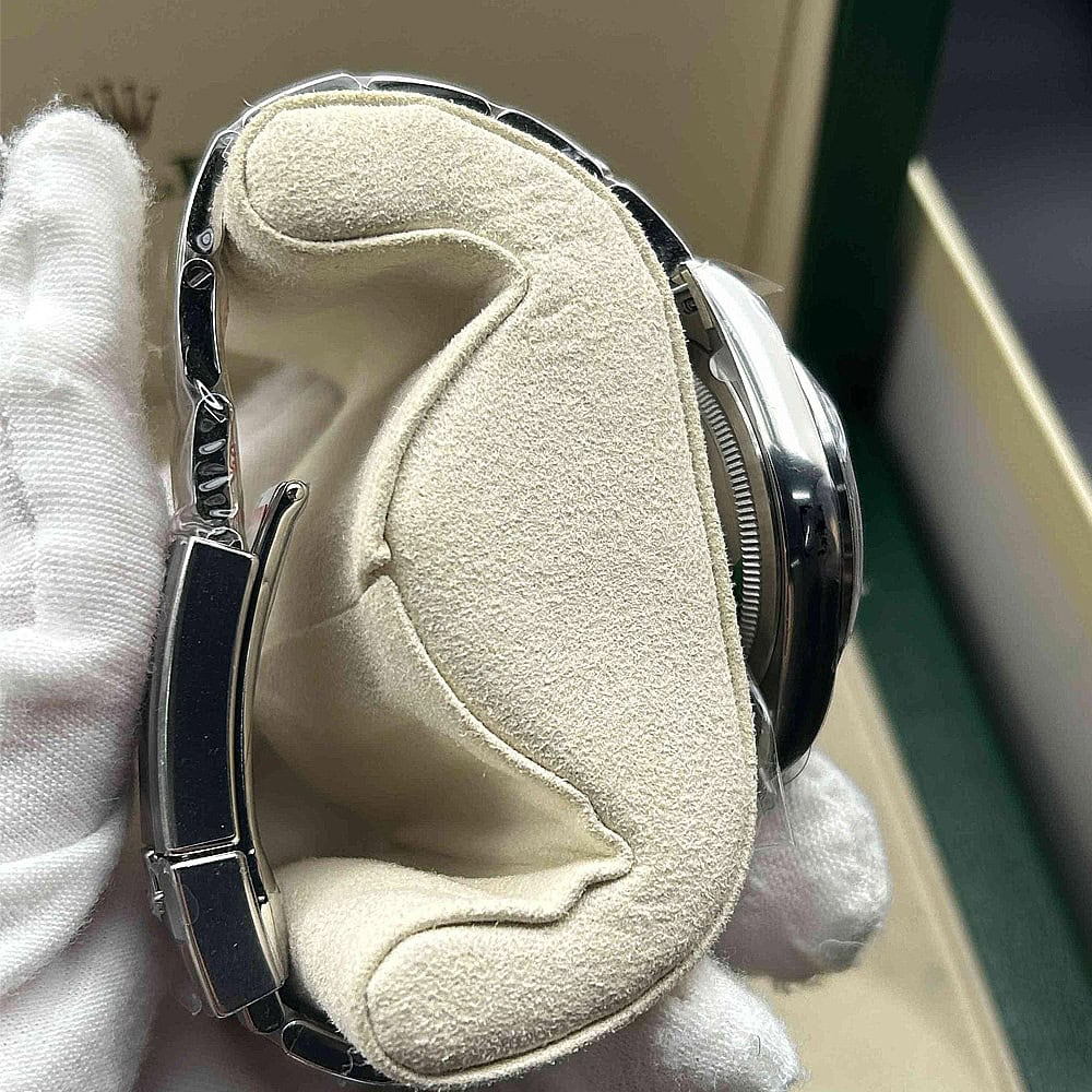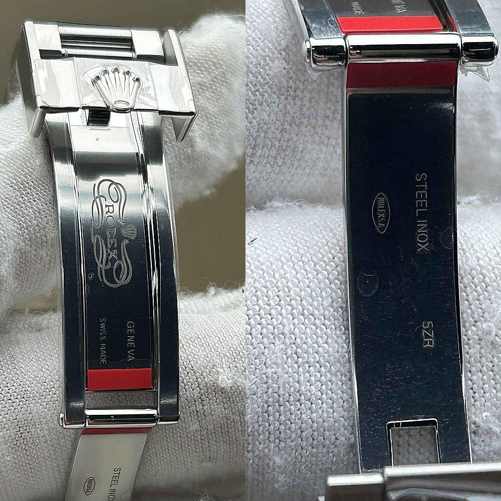 ベルト:オイスター デザインとフラット 3 ピース リンクのブレスレットはソリッド904Lステンレススチールで作り出されており、DLCスクラッチプロティングコーティングを施されています。しっかりとしたネジ山により、楽にベルト調整を実現し、5ミリをコンフォートエクステンションリンク(イージリンクとも言う)を備えた折りたたみ式オイスターロック安全クラスプも備えています。
