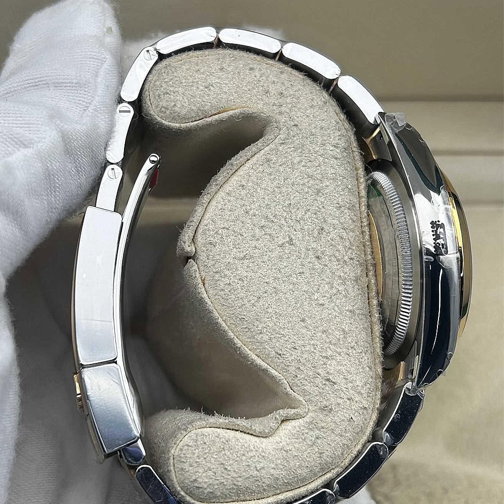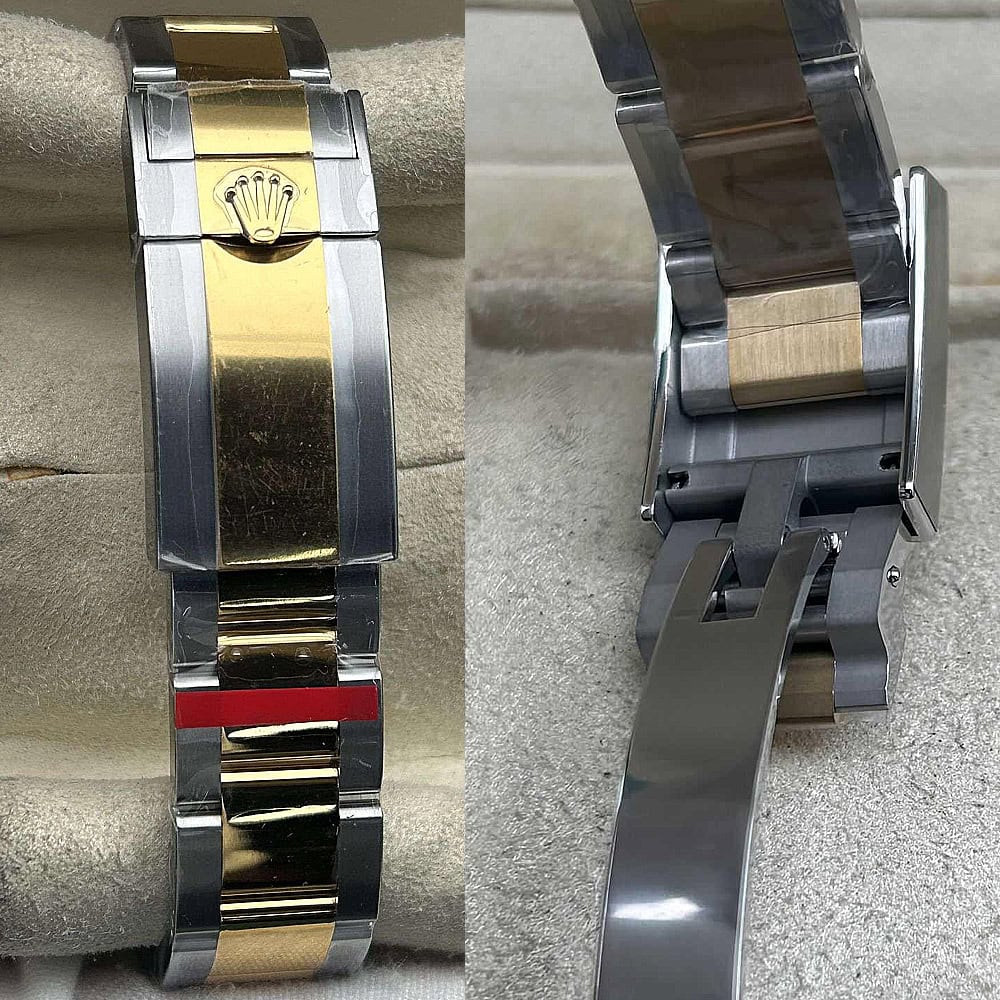 ベルト:オイスター デザインとフラット 3 ピース リンクのブレスレットは18Kイエローゴールドコーティングされたソリッド904Lステンレススチールで作り出されており、DLCスクラッチプロティングコーティングも施されています。しっかりとしたネジ山により、楽にベルト調整を実現し、5ミリをコンフォートエクステンションリンク(イージリンクとも言う)を備えた折りたたみ式オイスターロック安全クラスプも備えています。