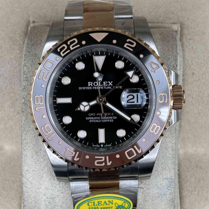 ムーブメント:126711CHNRの心臓部は1:1で確実に還元されたロレックス3285スーパークローンオートマッチクムーブメントです。このムーブメントは正しいシリアルナンバーを持っているのみならず、あらゆる部品には「Rolex Geneve」、「3285」ゴールド刻印があります。このムーブメントは28,800VPH(4Hz)でスムーズに作動しているスイープ針により、シームレスな計時を実現しています。スイスのナノオイル潤滑を採用したため、ムーブメント作動の静かさを確保しています。安価のロレックスレプリカのように、ガラガラの音がしません。精度は(-4/+6秒/日)範囲で、COSC認定基準以内に抑えられており、パワーリザーブは約36時間―48時間に達します。あらゆる部品は正規品と交換性があり、クリーンファクトリーは品質への拘りを表しています。