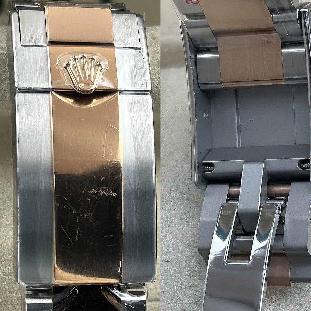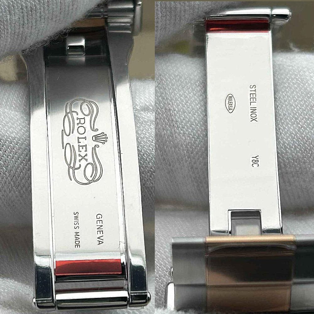 ベルト:オイスターデザインブルとは904Lグレードのステンレススチールによって作り出されたツートンカラー平たい3ピースリンクを備えています。DLCクスラッチプロティングコーティングされているのみならず、真ん中のリンクには18kローズゴールドメッキ加工も施されています。ソリッドなネジにより、簡単にリンクを取り外しでき、5ミリコンフォートエクステンションリンク(イージリンクとも言う)を含む折畳式オイスターロック安全スクラップにより、フィット感を確保しています。