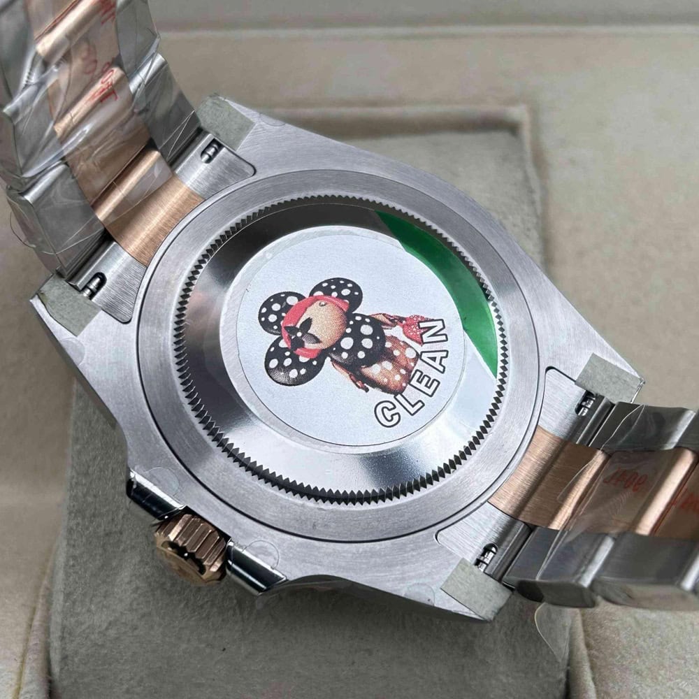 文字盤:ブラックラッカー文字盤には明るいスーパールミノバ蓄光コーティングされたアワーマーカーと針を取り付けられており、夜闇に9時間ぐらい発光でき、優れた視認性を確保しています。ロレックス正規品と100%同一した高精度なレーザーテキスト、プリント、刻印のおかげで、文字盤は高い可読性を確保しています。正しいデイトフォントとサイズも丹念にデザインされています。ローズゴールド色のGMTアローチップ針は24時間ごとに、エレガンスに文字盤を1周を回しています。アワーマーカーと針は18kゴールドコーティングされたため、色褪せしにくいです。