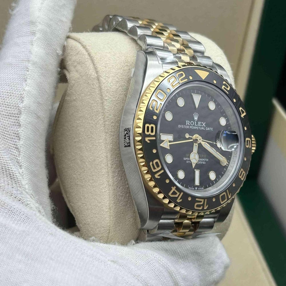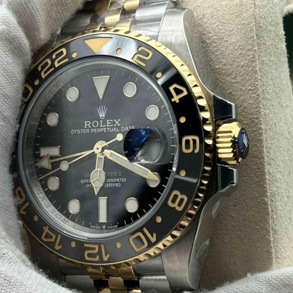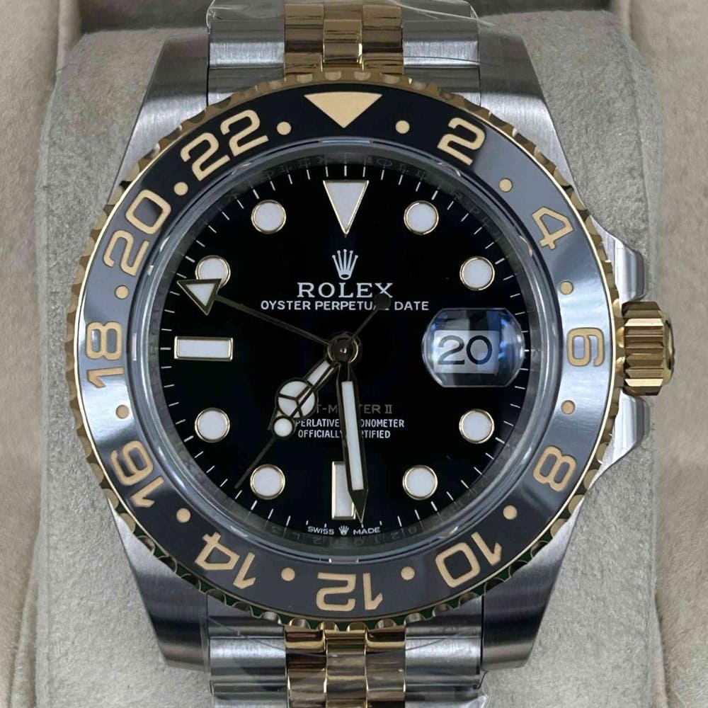 文字盤:ブラックラッカー文字盤と明るいスーパールミノバブルー蓄光コーティングされたアワーマーカを備えており、時計の優れた視認性を確保しています。レーザーによるテキスト、プリント、刻印が100%正規品と一致しています。正しいデイトフォントとサイズを備えており、24時間ごとに文字盤を1周回りするゴールドのGMT矢印針もそなえています。18kゴールドコーティングされたアワーマーカーと針は色褪せしにくいです。