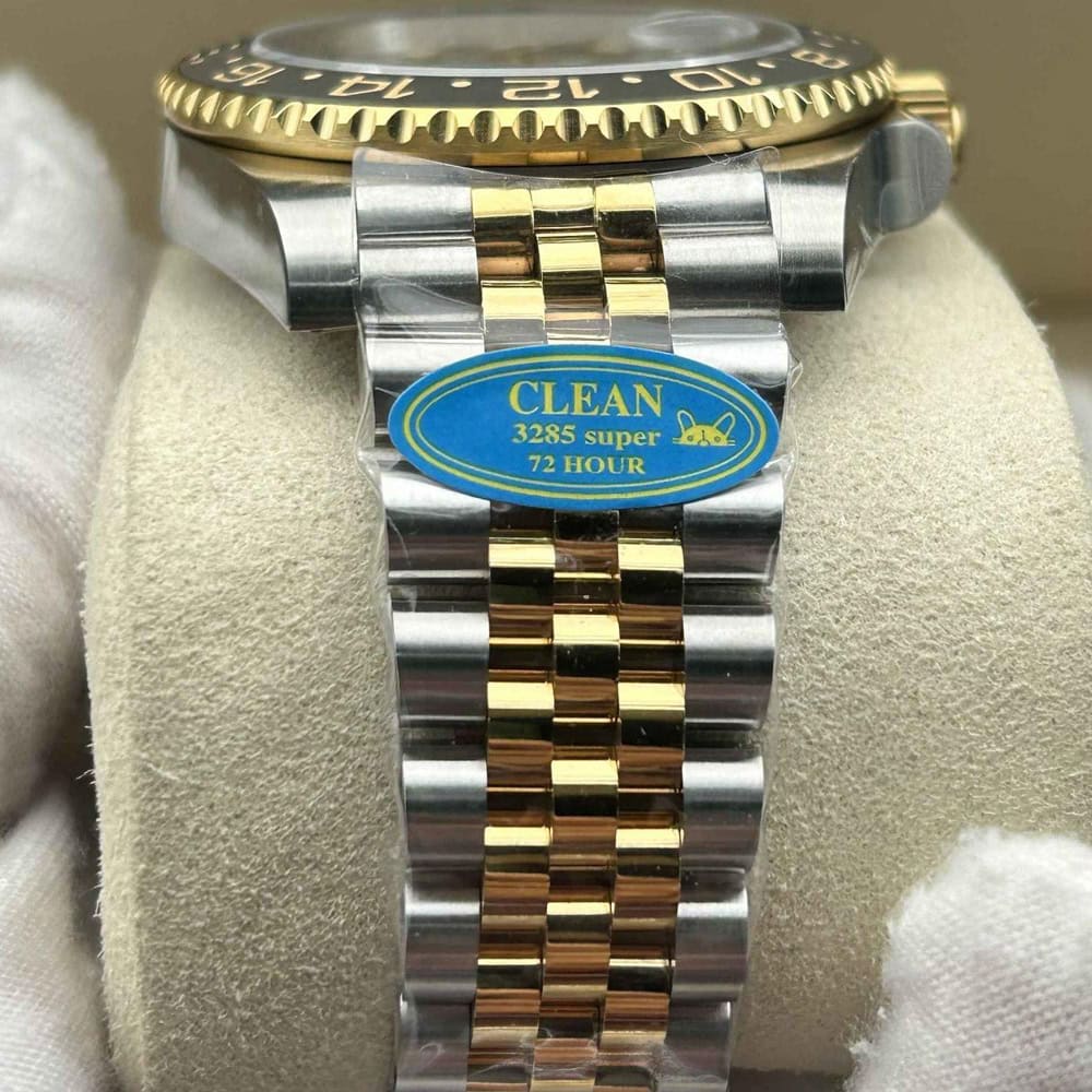 ムーブメント:この時計はロレックス3285スイスクローンムーブメントを備えており、第二時間帯を表示するGMT24時間針も搭載しています。正しいシリアルナンバーと、内側と外側一致するマッキングも青色耐磁ヒゲゼンマイ(パラクロム)とグリュシデュール製金メッキ耐磁テンプが時計の精度を確保しています。あらゆる部品は正規品と交換性があり、パーペチュアルローラーにより、オートマチック機械式両回転自動巻き上げを実現します。スイープ秒針は28,800VPH(4Hz)でスムーズに作動し、31石(レッドルビー)が使用されています。精度は(-4/+6秒/日)以内に維持されており、COSC認定範囲以内です。パワーリザーブはおおよそ48時間に達します。