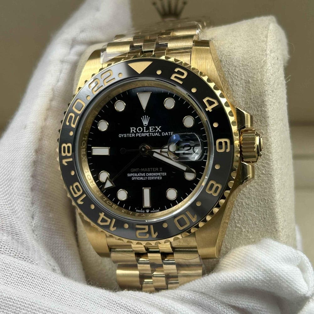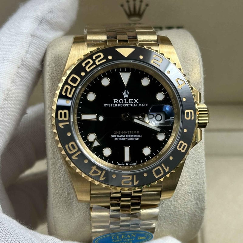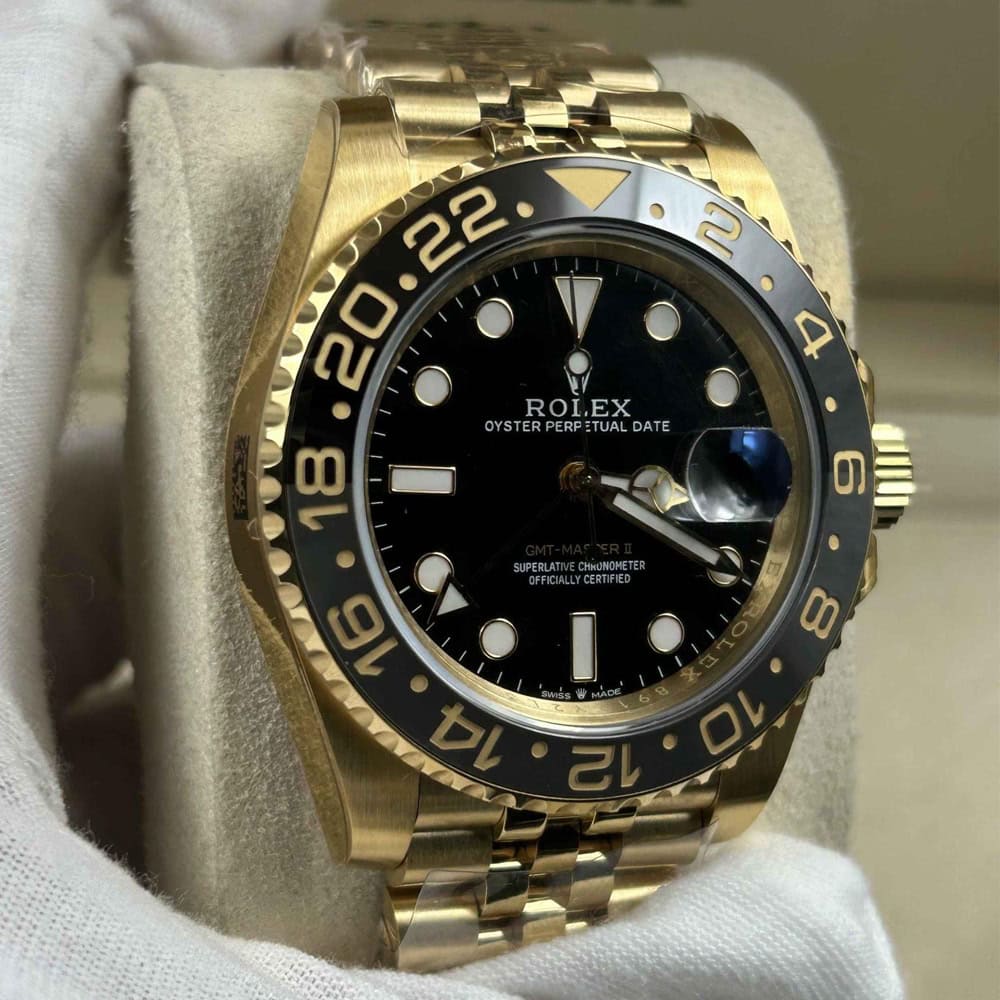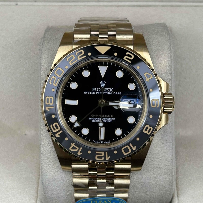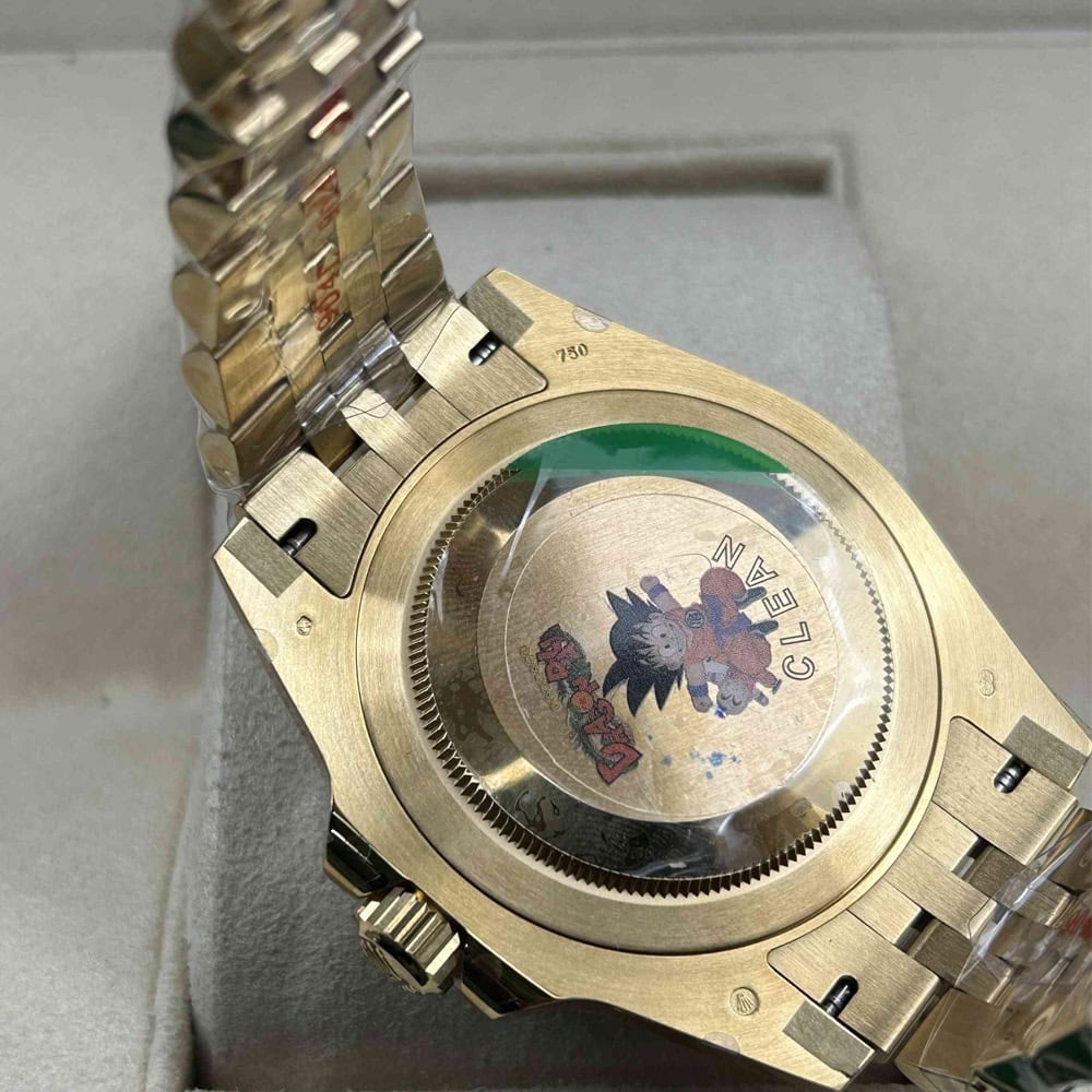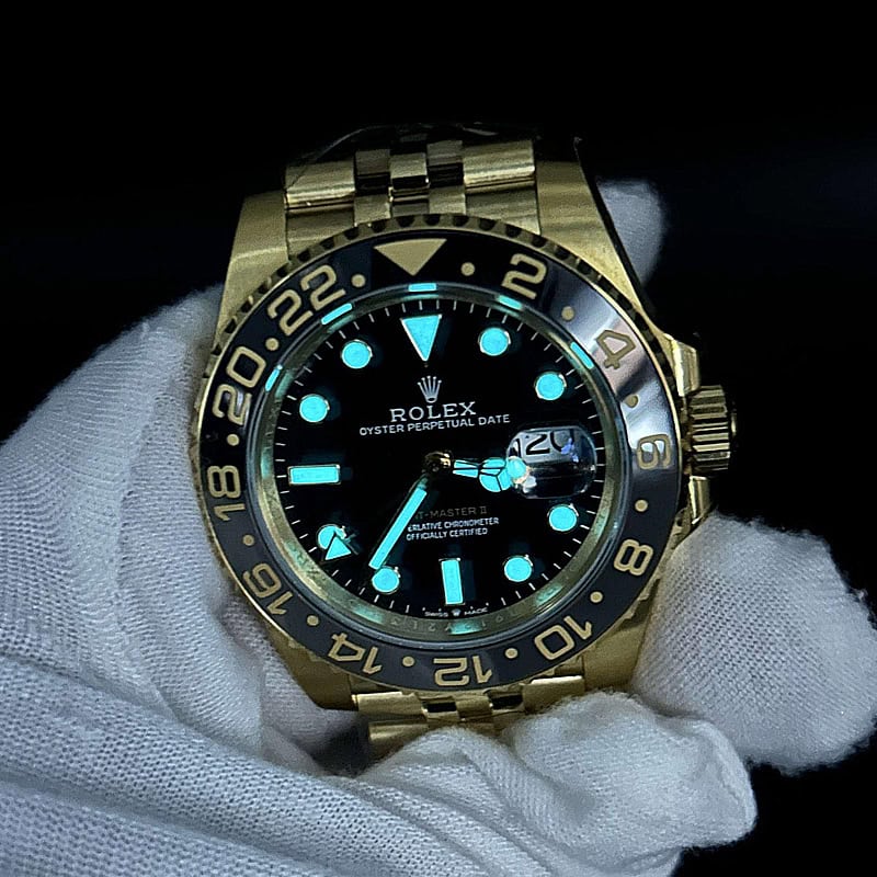 文字盤:ブラックラッカー文字盤と明るいスーパールミノバブルー蓄光コーティングされたアワーマーカを備えており、時計の優れた視認性を確保しています。レーザーによるテキスト、プリント、刻印が100%正規品と一致しています。正しいデイトフォントとサイズを備えており、24時間ごとに文字盤を1周回りするゴールドのGMT矢印針もそなえています。18kゴールドコーティングされたアワーマーカーと針は色褪せしにくいです。