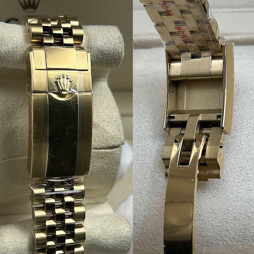 ベルト:ジュビリーデザインベルトは5ピースリングを備えており、ツートンカラー18Kイエローゴールドコーティングされた頑丈な904Lステンレススチールで作り出されており、DLCスクラッチプロティングコーティングも施されています。しっかりとしたネジ山は楽なベルト調整を確保し、折りたたみ式オイスターロック安全クラスプには Easylink 5 mm コンフォートエクステンションリンクが含まれており、素早く快適にベルトを装着できることを確保しています。