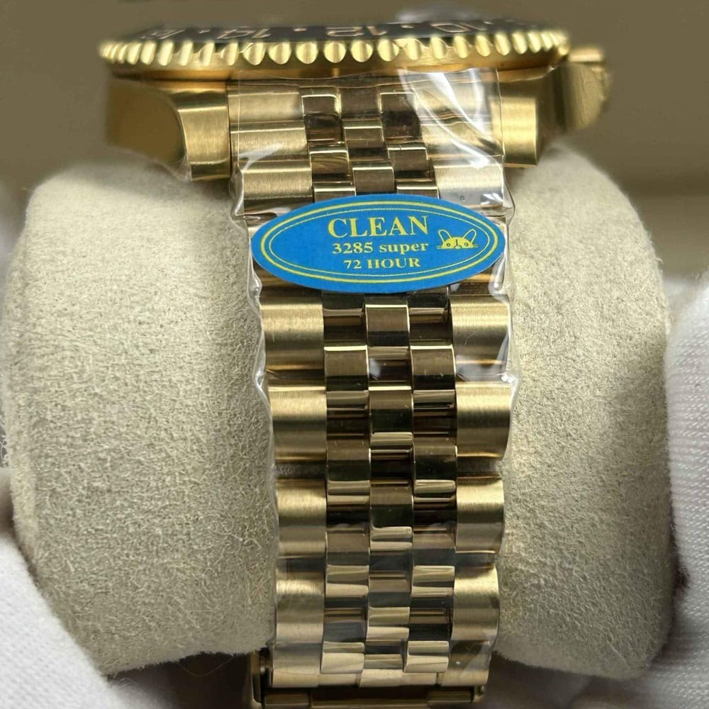 ムーブメント:この時計はロレックス3285スイスクローンムーブメントを備えており、第二時間帯を表示するGMT24時間針も搭載しています。正しいシリアルナンバーと、内側と外側一致するマッキングも青色耐磁ヒゲゼンマイ(パラクロム)とグリュシデュール製金メッキ耐磁テンプが時計の精度を確保しています。あらゆる部品は正規品と交換性があり、パーペチュアルローラーにより、オートマチック機械式両回転自動巻き上げを実現します。スイープ秒針は28,800VPH(4Hz)でスムーズに作動し、31石(レッドルビー)が使用されています。精度は(-4/+6秒/日)以内に維持されており、COSC認定範囲以内です。パワーリザーブはおおよそ48時間に達します。