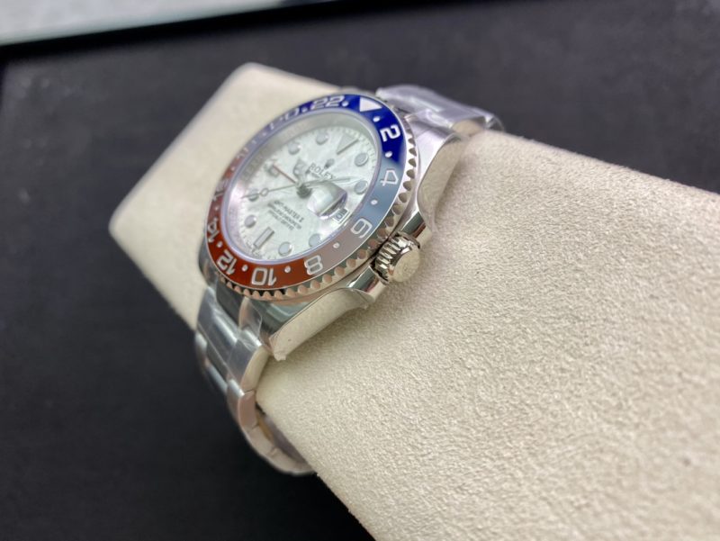 ベゼル:24 クリックで双方向に回転できる24時間両回転ベゼルを備えており、計時の正確性を確保します。耐傷性ある青と赤の2色(ペプシーとも言う)セラクロム セラミック インサートに刻まれた数字と目盛りは本物のプラチナでコーティングされており、時計に高級感を加えます。