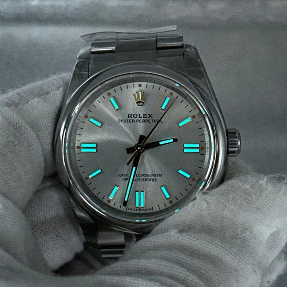 ケース:36ミリオイスターケースを備えており、この時計はモノブロック構造の904Lステンレススチールによって作り出されています。この904Lグレードのスチールは、ロレックスの「オイスタースチール」ステンレススチールウォッチに採用されているものと同じもので、錆びにくいことで知られています。この時計はねじ込み式ケースバックと巻上げニューズを備えたため、時計の防水性を確保しています。RehautリンクにはROLEX ROLEX刻印を刻まれており、正しいアライメントを保証しています。寸法と重さも正規品と一致しており、正規品と1:1でマッチングすることを実現しています。