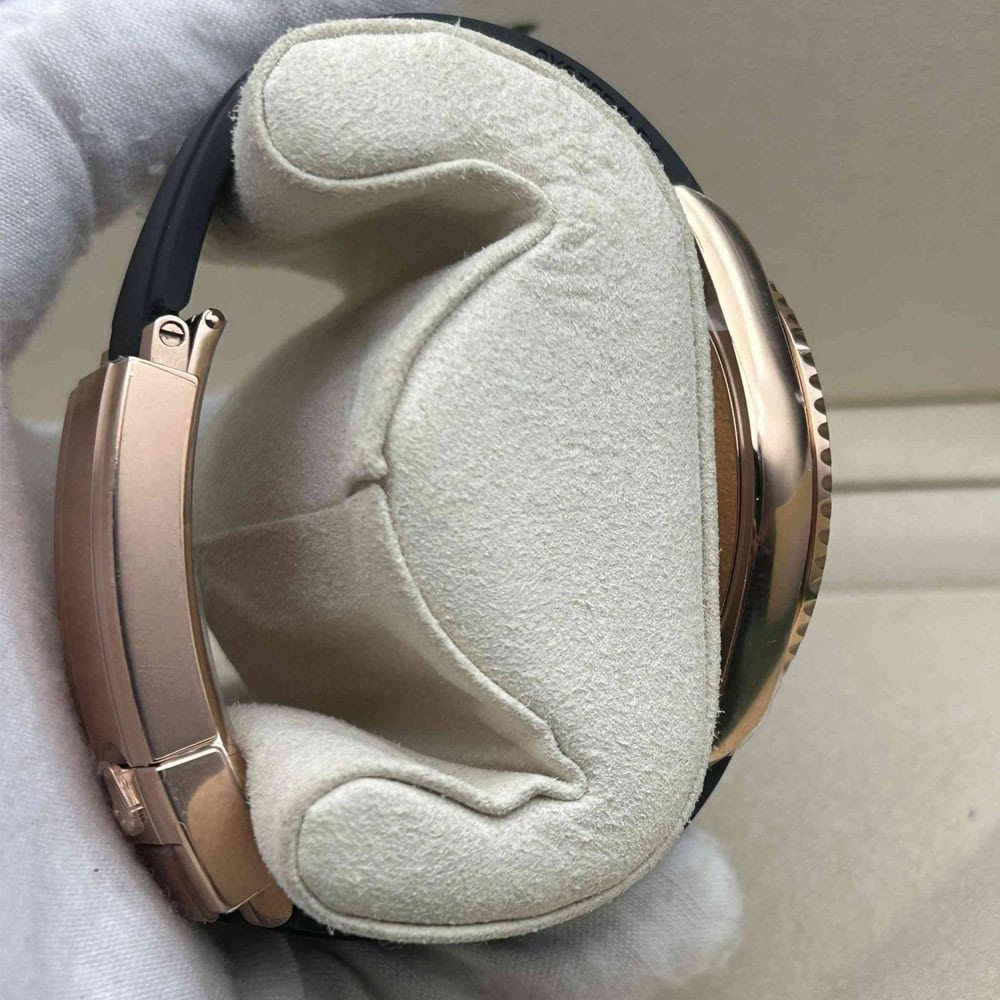 ベゼル:18K ゴールド加工を施されたソリッド 904L ステンレススチールで作り出されたベゼルは、セラミックのマットブラック セラクロム インサートを誇っています。120 クリックの双方向回転機能と 60 分の目盛を備えています。盛り上がったポリッシュ仕上げ目盛りとサンドブラスト仕上げが時計の上品さを引き出します。数字と目盛りには18Kローズゴルードコーティングを施されております。刻印とデザインが100%正規品と同じです。