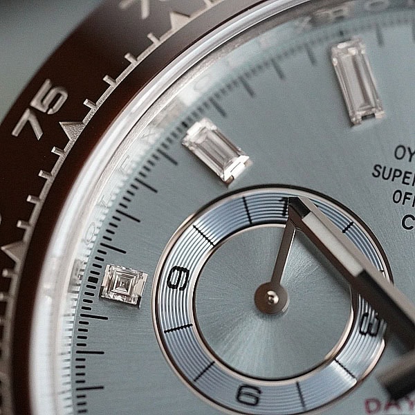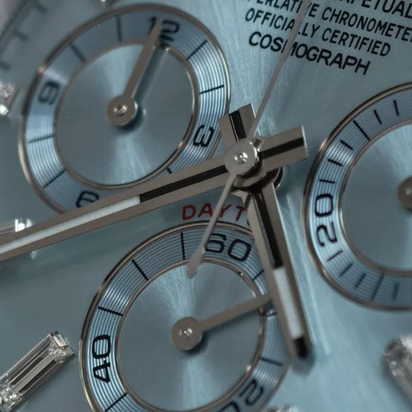 文字盤:アイスブルーの文字盤はモアサナイト・ダイヤモンドのアワーマーカーが特徴で、