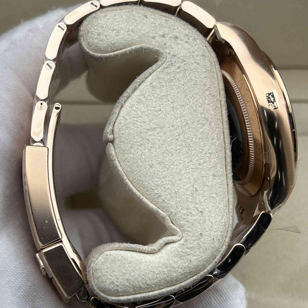 ベルト:ベルトは平たい3ピースリンクを象徴とするクラシックなオイスターデザインを採用されており、18Kローズゴールドコーティングされた904Lステンレススチールで作り出されており、DLCスクラッチプロティングコーティングも施されています。ベルトはしっかりとしたネジ山と5 mm コンフォート エクステンション リンク(イージリンクとも言う)を備えた折りたたみ式オイスターロック安全クラスプを含まれています。