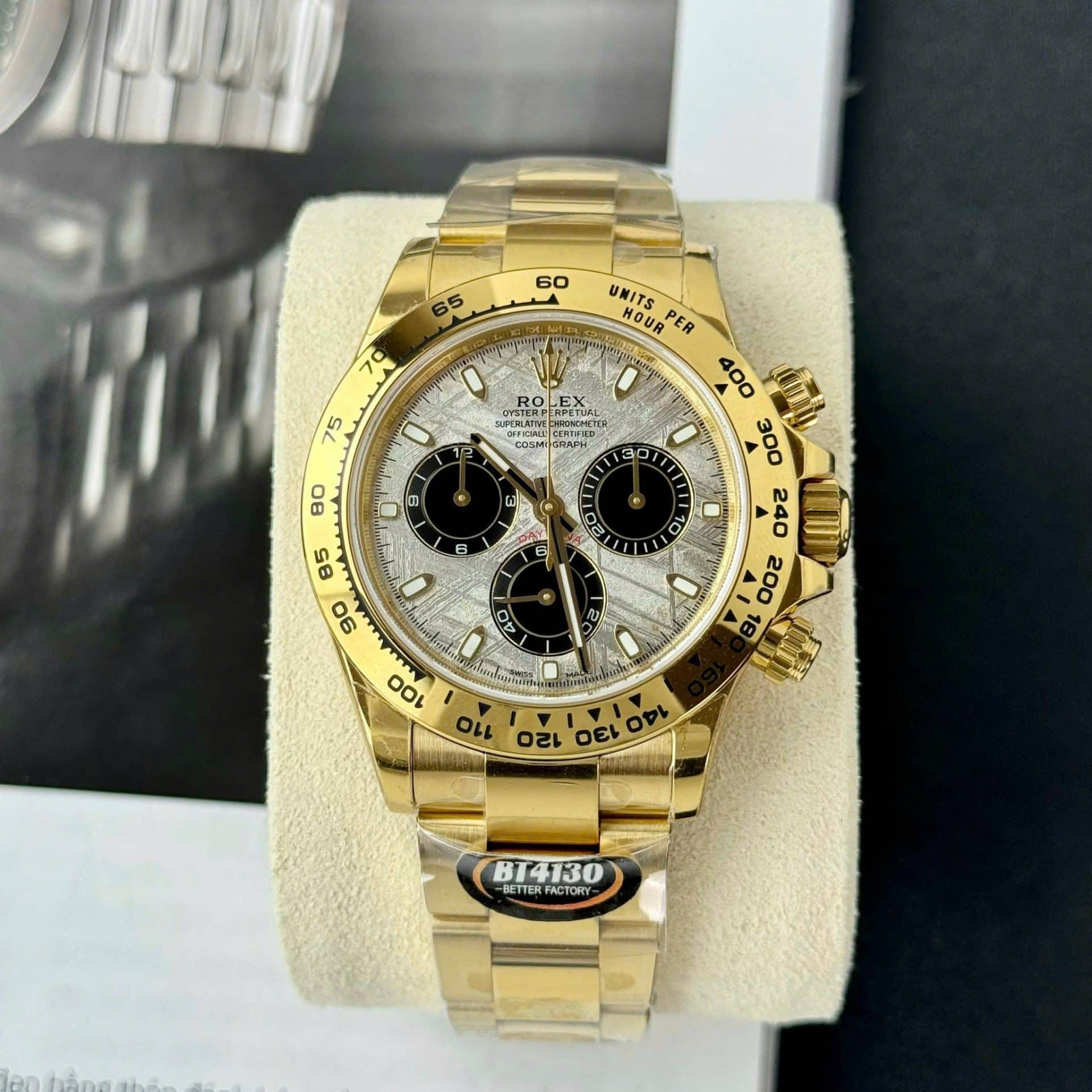 高いコストを厭わずに、ベゼル、風防ガラス、内部カバー、ダイヤル、針、バックルなどの部品を本物と見分けがつかないレベルで製造しています。ロレックスのデイトナ・コレクションには、さまざまな色と素材が用意されているが、なかでも最も貴重なのがメテオライト・フェイスである。 隕石は爆発した小惑星や惑星のコアで、地球の軌道に入るまで太陽系を旅し、重力で引きずり降ろされた物質である。 宇宙空間を漂う隕石のコアは、溶融状態から徐々に冷却され、並外れた金属的な質感に変化する。 ロレックスのデザイナーは、この隕石の構造を利用して、コスモグラフ・デイトナをはじめとするロレックスの最高級時計に独自の要素を加えている。 隕石を切断する難しさを克服し、ロレックスの時計職人は専門家と協力して隕石を高温高圧で加工した結果、ニッケル-鉄の緻密な結晶が独特の「ウィドマンシュテッテン」(「ウィドマン模様」)を形成した。 ウィドマンシュテッテン」は、ディトナーの文字盤に適した厚さにカットされ、見事な質感を持つ18Kイエローゴールドの中に独特の魅惑的な表情を浮かべています。 メテオライト文字盤の独特な質感から、それぞれの時計はユニークピースと呼ぶことができます。