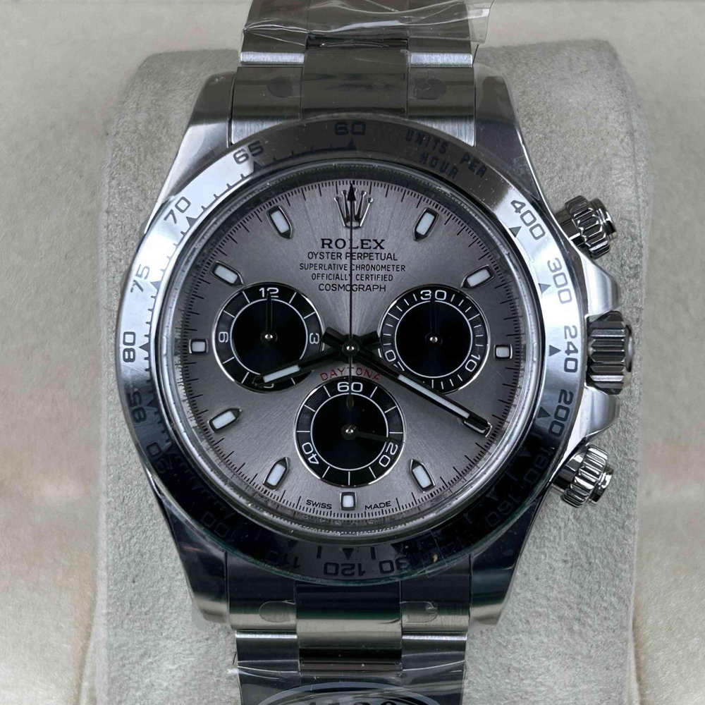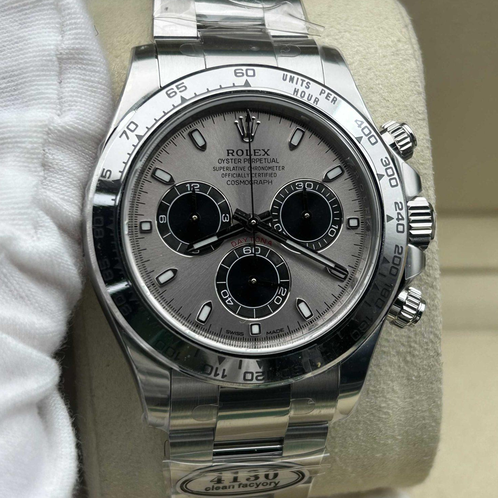 ベゼル:クリーンファクトリーは18Kホワイトゴールドでコーティングされた頑丈な904Lステンレススチール製の固定ベゼルを採用しています。 ベゼルには黒くコーティングされた数字と目盛りが刻まれたタキメータースケールが備わっています。構造とデザインは本物のロレックスと100%一致しています。