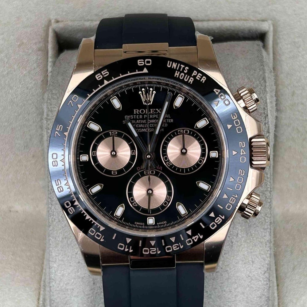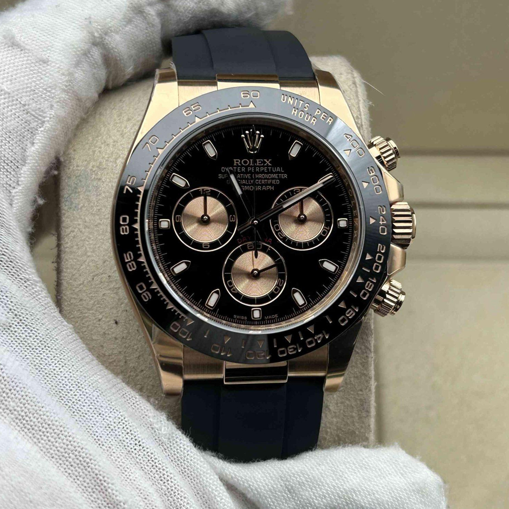 ベゼル:頑丈なブラックのモノブロック・セラミックベゼルが固定されており、タキメータースケールが刻まれています。数字と目盛りは18Kローズゴールドでコーティングされており、すべての細部においてオリジナルのロレックスデザインと一致しています。