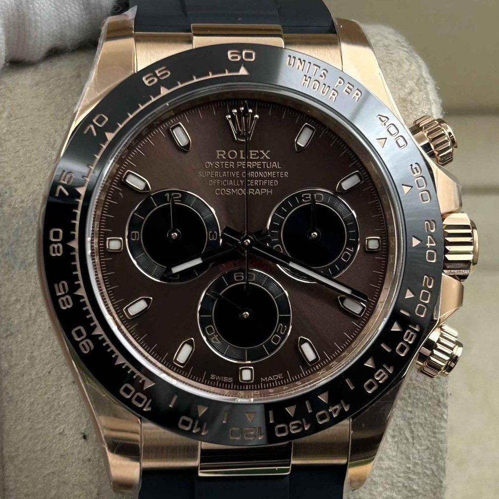ベゼル:頑丈なブラックのモノブロック・セラミックベゼルが固定されており、タキメータースケールが刻まれています。数字と目盛りは18Kローズゴールドでコーティングされており、すべての細部においてオリジナルのロレックスデザインと一致しています。