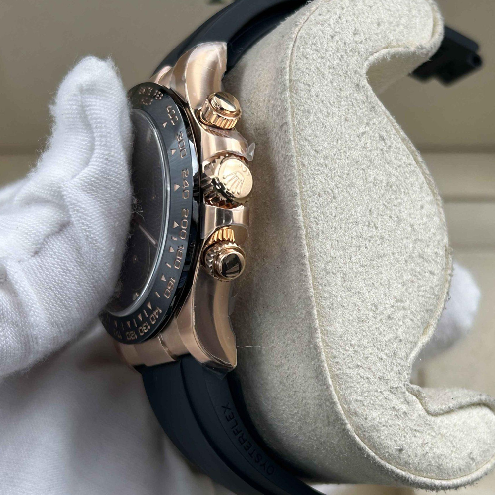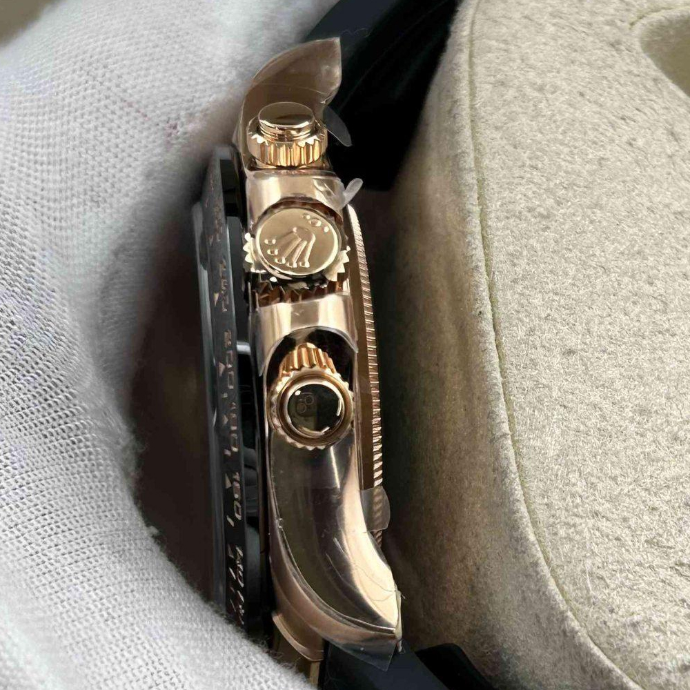 ベゼル:頑丈なブラックのモノブロック・セラミックベゼルが固定されており、タキメータースケールが刻まれています。数字と目盛りは18Kローズゴールドでコーティングされており、すべての細部においてオリジナルのロレックスデザインと一致しています。