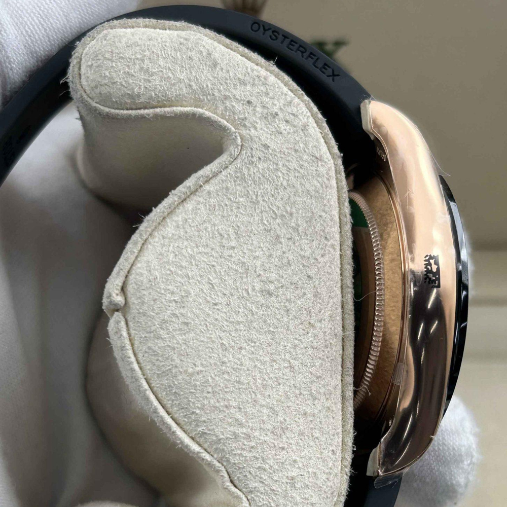 ベルト:メタルブレードの芯にブラックのエラストマーをオーバーモールドされた高性能のラバー製オイスターフレックス・ブレスレットは耐久性と快適性を備えております。 ベルトには18kローズゴールドコーティングされたソリッドな904Lステンレススチールによって作り出された折畳式オイスター安全スクラップを備えており、確実なフィット感を確保しております。