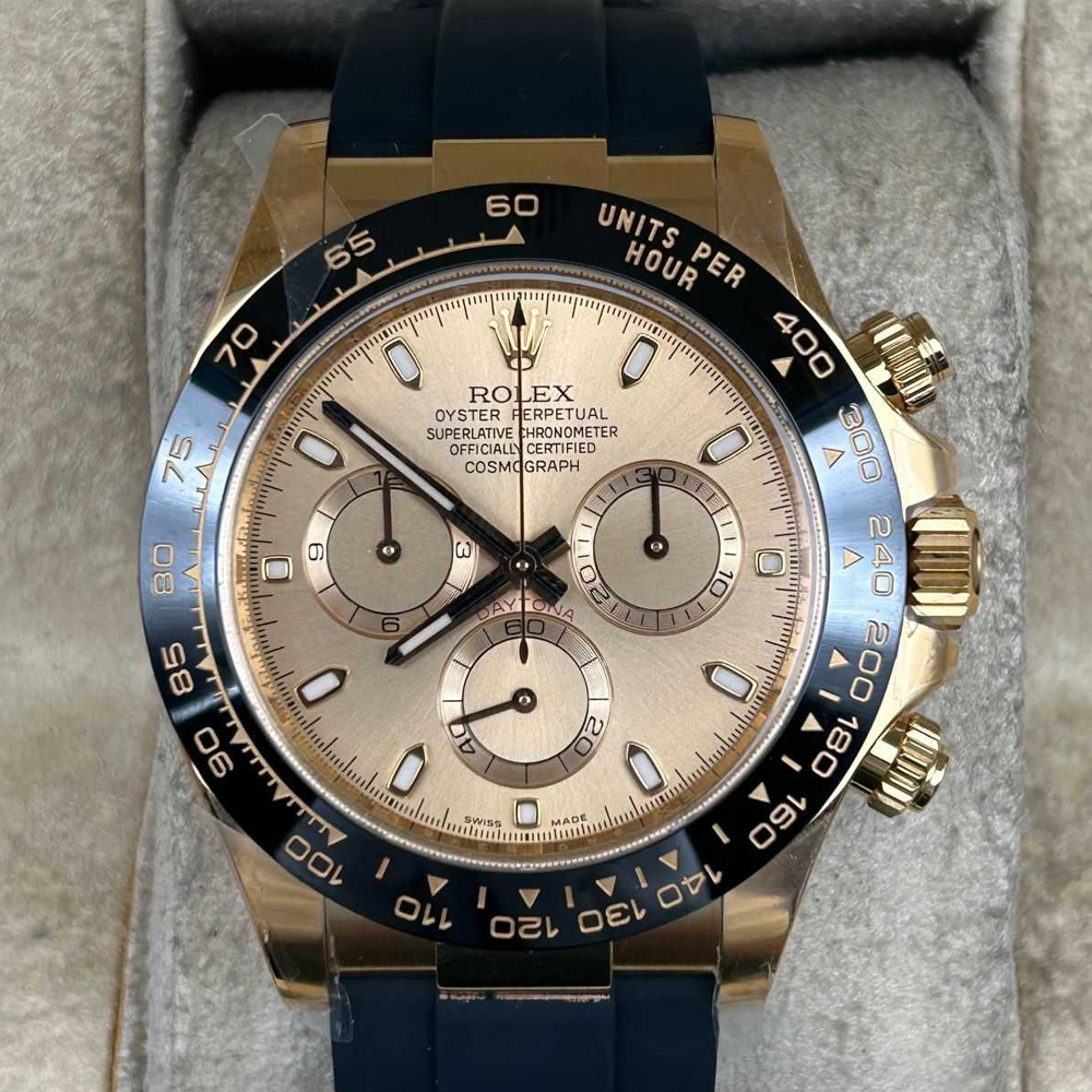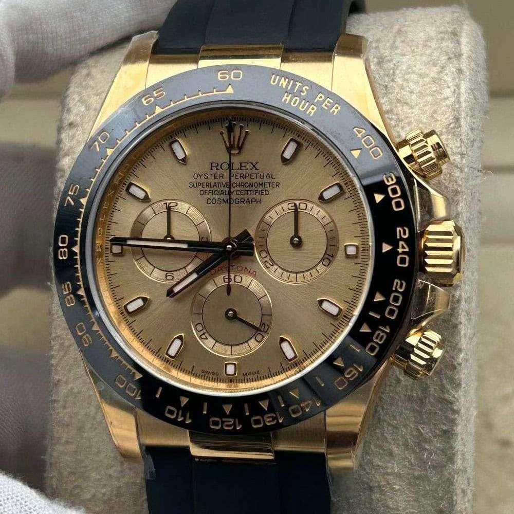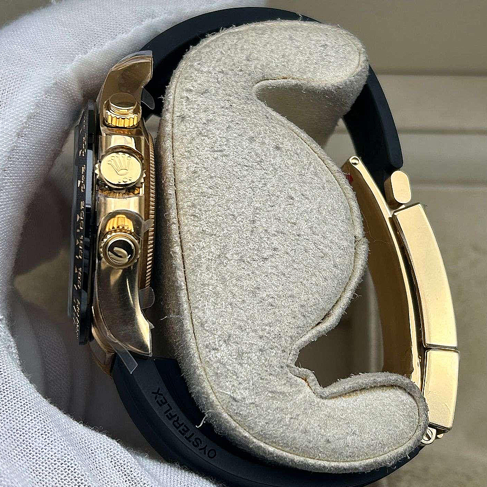 ベゼル:頑丈なブラックのモノブロック・セラミックベゼルが固定されており、タキメータースケールが刻まれています。数字と目盛りは18Kイエローゴールドでコーティングされており、すべての細部においてオリジナルのロレックスデザインと一致しています。
